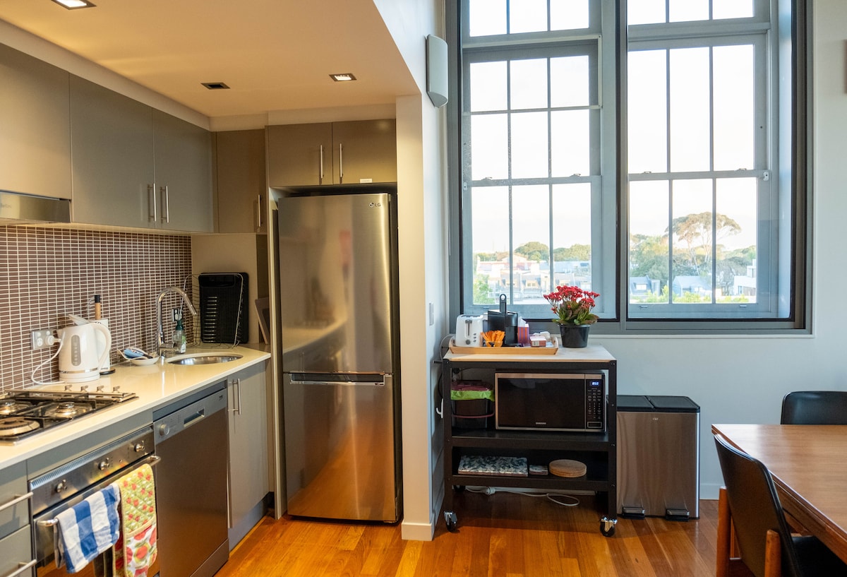 Насолоджуйтеся коротким або тривалим перебуванням в нашій чудовій, щойно відремонтованій квартирі-студії в центрі Ньютауна. Ідеальне розташування 2 хвилини ходьби від вокзалу Ньютауна, близько до всіх дій, але розташований в тилу бутик-квартирного будинку і тому дуже тихий. Студія розташована навколо світлонаповненого атріуму і має приголомшливий сад на даху з видом на всю місцеву місцевість. На даху є столи, стільці та лаундж для ранкової кави!