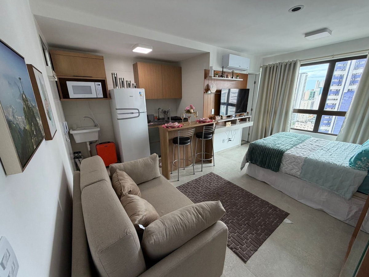 ⭐️⭐️⭐️⭐️⭐️ Ласкаво просимо до вашого помешкання в Боа-Віажен! Відмінне розташування, повноцінна студія, з двоспальним ліжком та диваном-ліжком, спліт-система кондиціонування повітря, смарт-телевізор, Wi-Fi, робочий та обідній стіл, повністю обладнана кухня з варильною поверхнею, мікрохвильовою піччю та посудом, шафа, дзеркало, планові меблі, постільна білизна та рушники. Цілодобова стійка реєстрації, гараж, басейн, сауна, фітнес-центр і продуктовий магазин. Чудове розташування: торговий центр Recife (5 хвилин ходьби), пляж (10 хвилин ходьби) та гіпермаркет навпроти. Забронюйте зараз і насолоджуйтеся враженням!