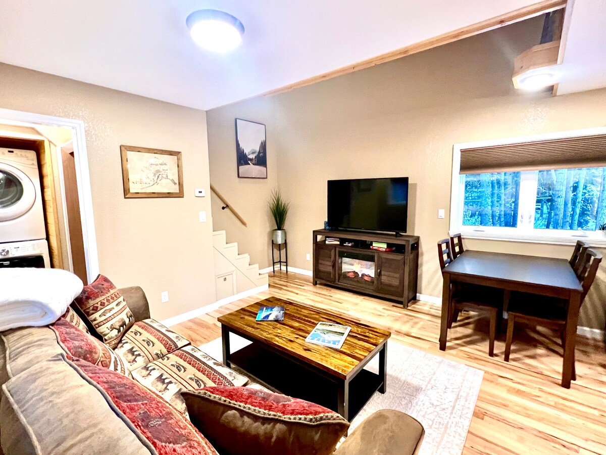 Ми щойно побудували цю сучасну квартиру на Алясці, щоб забезпечити максимальний комфорт і досвід нашим гостям. Насолоджуйтеся спокійною ванною з струменем із індивідуальним душем. Станьте затишним на лежачому шкіряному дивані, дивлячись фільм на HD-телевізорі. Спати комфортно на ліжку King Size з пінопластом. Поруч аеропорт, UAF, ресторани, стежки, магазини та туристичні об 'єкти. Пральна та сушильна машини в блоці! Ми надаємо деякі сніданки, такі як миттєва вівсянка, млинцевий мікс, чай і кава.