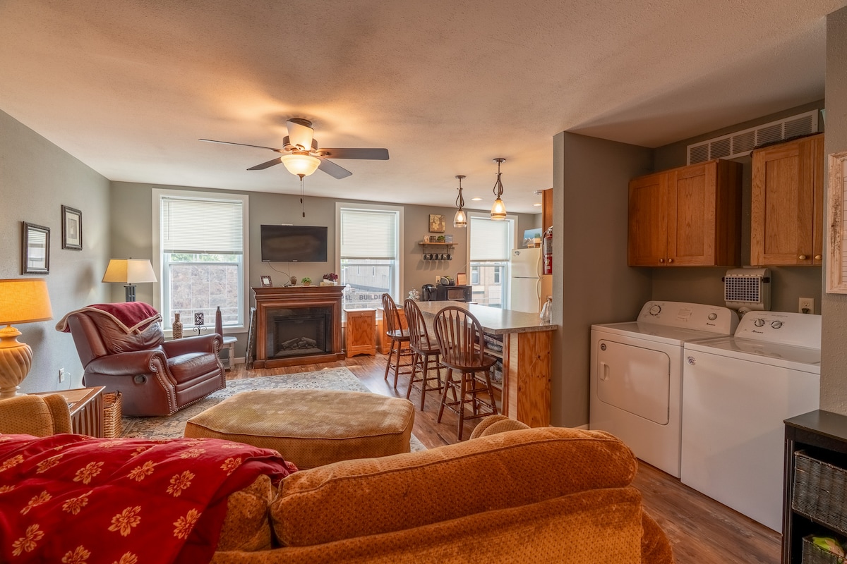 Затишна, бохо-шикарна, приватна квартира на другому поверсі, розташована на дивній Головній вулиці Блакитної Землі. Зручно розташований за межами I-90 і Hwy 169. На відстані прогулянки знаходяться продуктовий магазин, спеціалізовані магазини, кав 'ярня/магазину морозива, парки, церкви та басейн. Окремий вхід, одна спальня, невелика ванна кімната, повністю обладнана кухня, їдальня, затишна вітальня з вікном, що виходить на головну вулицю. Зверніть увагу, що існує ймовірність шуму. Зручно розміщується троє дорослих. Ідеально підходить для сім 'ї з чотирьох осіб.