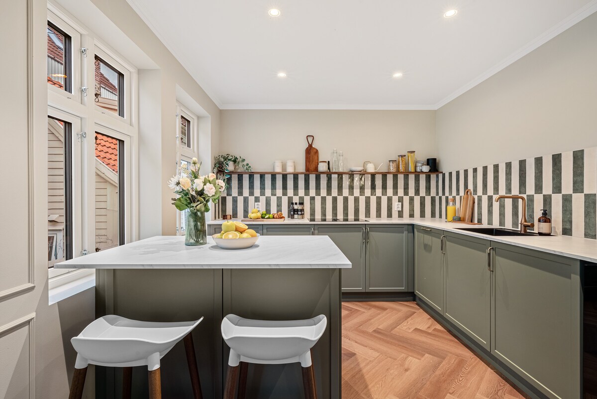 Просторе та сучасне помешкання в тихому приморському районі з панорамними краєвидами. Оскільки це найнижчий будинок на вулиці, попереду немає жодних об'єктів нерухомості, що забезпечує вам приватне та спокійне місце біля моря. Насолоджуйтеся великою закритою терасою з садовими меблями, шезлонгами, барбекю та джакузі – ідеальне місце для довгих літніх днів і вечорів. У помешканні також є приватна кінотеатральна кімната, дві вітальні та простір для більших груп. Розташоване всього за 20 хвилин від центру Бергена, за 5 хвилин від пляжу/пішохідних маршрутів