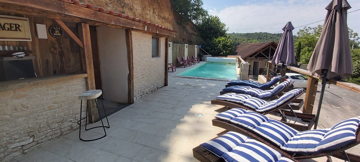 Красивий котедж з балками та відкритим каменем, щойно відремонтований у листопаді 2019 року Парковка та вхід до приватного двору з критою терасою для їжі та власним джакузі. Французькі двері в будинок Кухня повністю обладнана, вітальня має дуже зручні меблі та симпатичний французький антикваріат, Річка Везер знаходиться всього в 50 метрах на нашій власній землі, чудово підходить для катання на каное, дикого плавання та пікніків. 2 хвилини на автомобілі до приголомшливого середньовічного селища, 25 хвилин від центру Сарлата