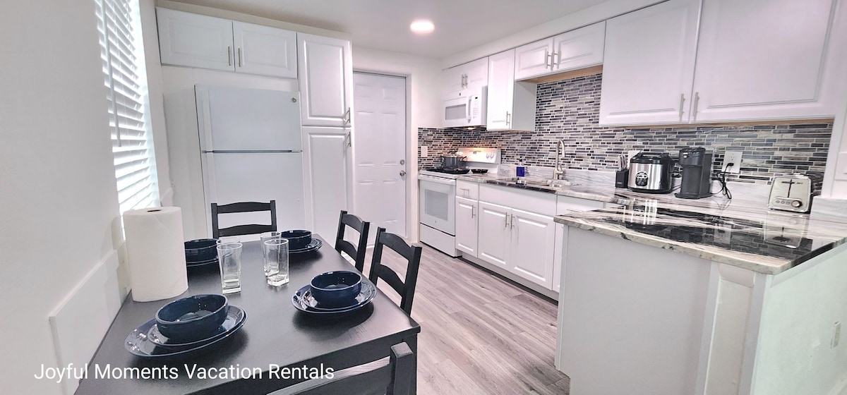 Welcome to our stunning 2-bedroom, 1-bath unit, designed for comfort and relaxation. Enjoy a renovated full-size kitchen and spacious bedrooms, including a master bedroom with a queen bed and a second bedroom featuring a full-size bed with a twin pull-out trundle bed. The living room offers additional sleeping with a queen-size memory foam sofa sleeper. Step outside to your own backyard paradise, complete with outdoor lighting, stylish furniture, a fire pit, BBQ grill, and fun outdoor games.