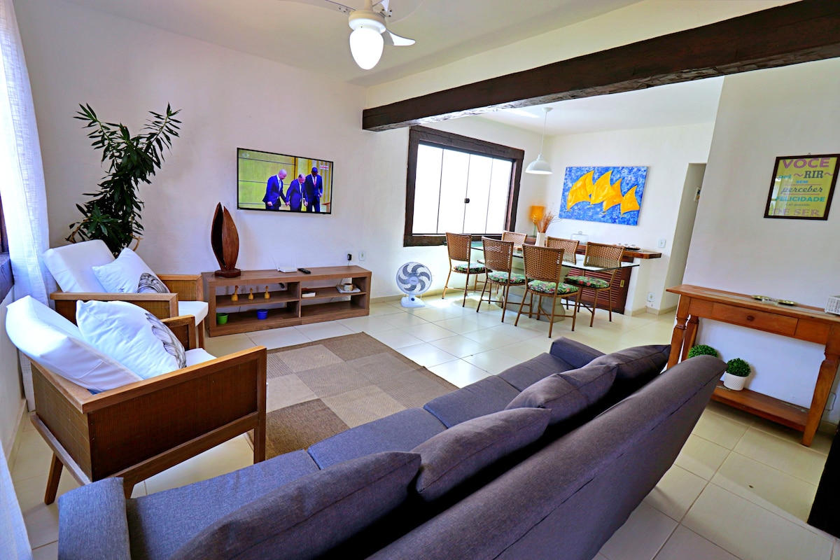 Красивий будинок з басейном в оточенні рідного лісу з басейном, ідеально підходить для відпочинку та насолоди з сім 'єю, що складається з 3 спалень, 1 люкс з гардеробною кімнатою на верхньому поверсі з телевізором і двома спальнями на першому поверсі, ванною кімнатою, вітальнею/телевізором, кухнею американської кухні, зони барбекю з піцерією, балконами, гамаком для відпочинку. Він має швидкий і практичний доступ до пляжу Феррадура, який знаходиться всього в 150,00 метрах. Будинок повністю обладнаний ліжком і постільна білизна. WI-FI