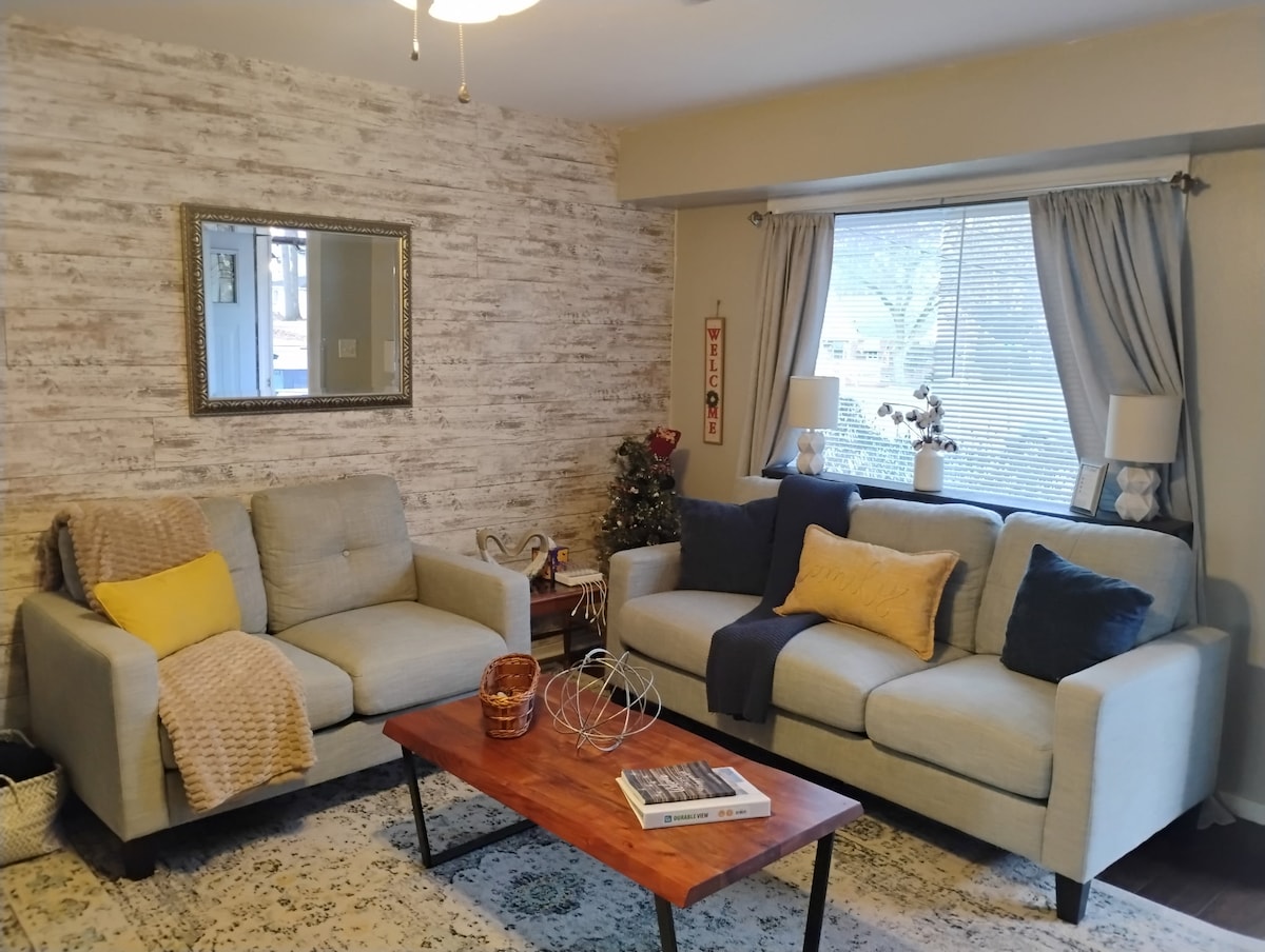 *Ми всі готові до Різдва, дерево і гарячий шоколад чекають на таких приємних гостей, як ви! Це великий затишний дуплекс на першому поверсі з величезним 55-дюймовим телевізором у вітальні, величезним диваном!! Відкрита концепція для їдальні з великим мармуровим столом. Майстер з ліжком King sz і 55-дюймовим телевізором, ліжком queen-size у другій спальні. (Також є додаткове повноцінне ліжко). Патіо поза кухнею з великим огородженням у дворі. На терасі є вбудована гідромасажна ванна, багато місць для відпочинку на відкритому повітрі, місце для багаття з кріслами-гойдалками!