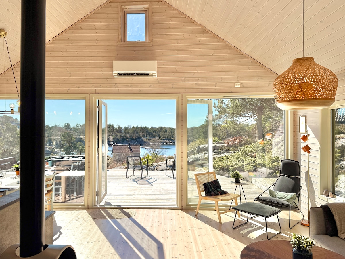 The cabin is surrounded by nature, with access to salt- and freshwater activities. Six-meter-wide panoramic windows open onto a sunny deck for barbecuing, sharing meals, lounging, or resting in the hammock. At night, light the fire pit, pop some popcorn, and enjoy the starry sky. Families will appreciate the child-friendly setup, while adults can enjoy the bright Scandinavian design. It's an ideal base for exploring beaches, woods, Kristiansand, Dyreparken Zoo, Aquarama, and more.