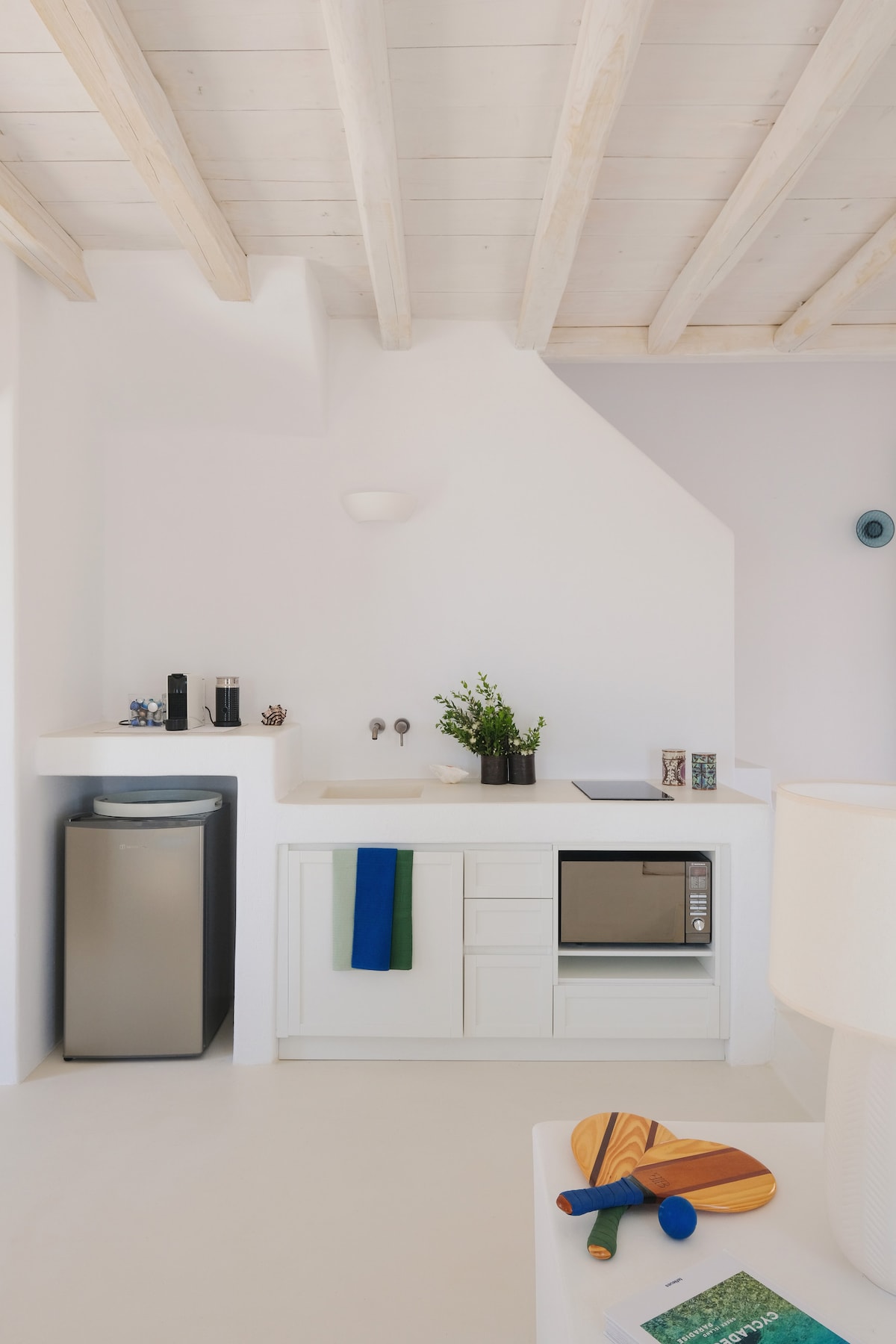 Пляжний будинок із відкритим простором, 60 кв.м. на 6 осіб з 1 двоспальним ліжком, 2 диванами-ліжками та 2-ю кімнатою з 2 односпальними ліжками, дуже стильними та зручними. Вона прикрашена богемним і затишним дизайном у поєднанні з кікладською культурою. Будинок має прямий вихід на веранду з видом на море, з великим обіднім столом. Воно розташоване на невеликій затоці з схожими білими місячними скелями, як Саракініко, які утворюють затишну бухту перед будинком, разом з аква-будинками 1 і 3. Вітальний кошик із місцевими продуктами.