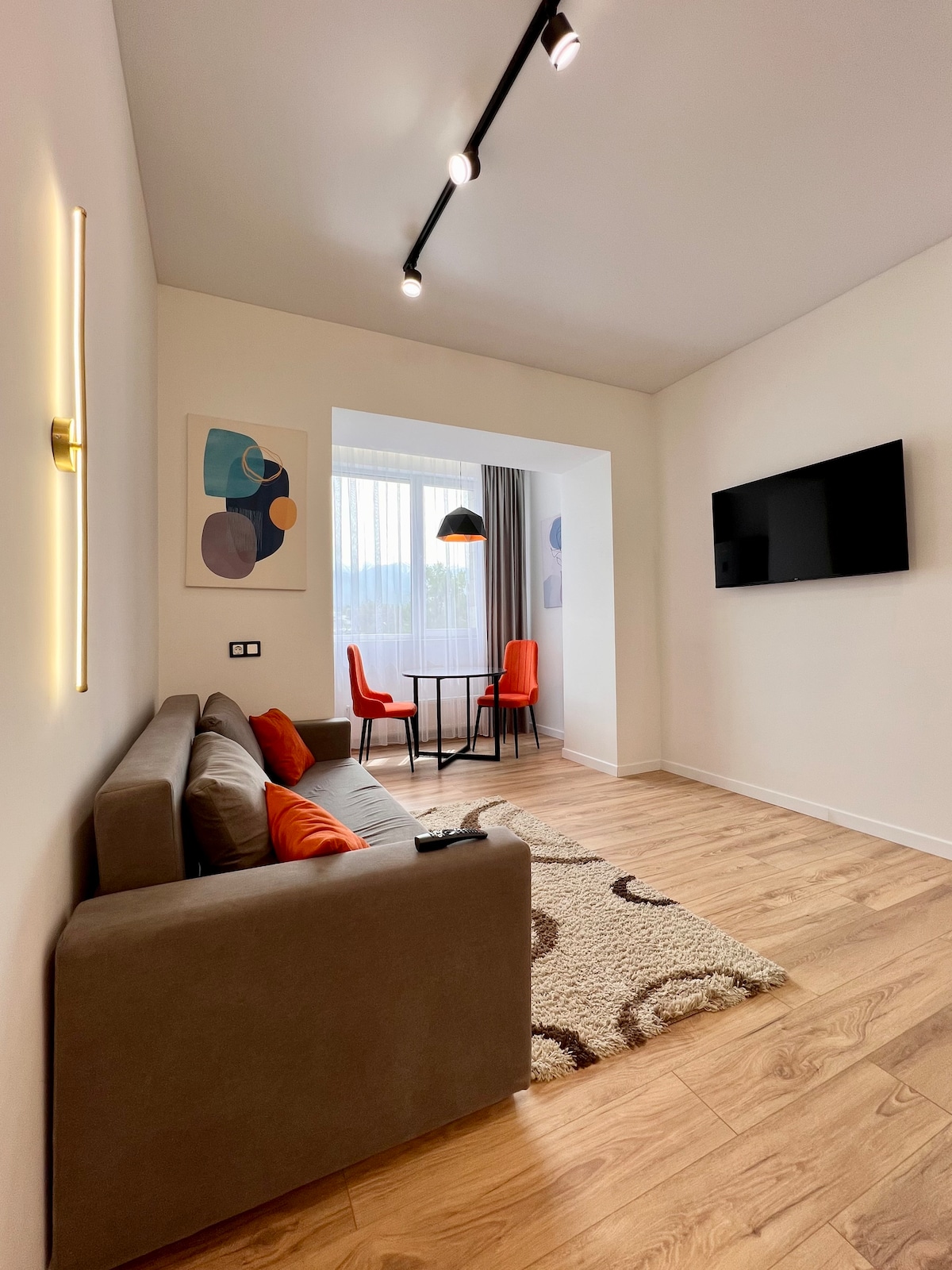 Стильна, простора 2-кімнатна квартира площею 55 кв.м. Дизайнерський ремонт. Усе продумано до дрібниць. Красива спальня з великим ліжком, диваном із журнальним столиком і шикарним видом на гори. Вітальня з великим розкладним диваном, смарт-телевізором. Кухонна зона з усім необхідним. Високошвидкісний Інтернет. Дві ізольовані ванні кімнати та душ. Доступ без ключа. Цілодобова охорона. Затишний тихий двір. Розташований у найсучаснішому районі міста. Найближчий торговий центр знаходиться у 2 хвилинах ходьби.