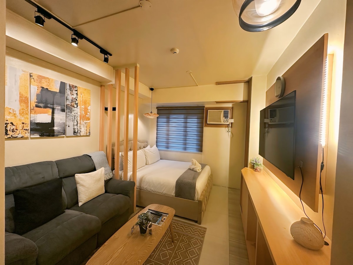 Ласкаво просимо до цієї затишної студії в Кесон-Сіті, вашому ідеальному помешканні для відпочинку! У помешканні є зручне двоспальне ліжко, 55-дюймовий смарт-телевізор із Netflix, Disney+ і HBO Go у поєднанні з розкладним диваном, компактна, але повністю обладнана міні-кухня, а також стильна вітальня, яка ідеально підходить для відпочинку після дня досліджень. Ця студія з кафе, ресторанами та пам 'ятками знаходиться всього в декількох кроках, незалежно від того, чи ви тут у справах, чи для відпочинку, ця студія обіцяє чудове перебування в центрі міста.