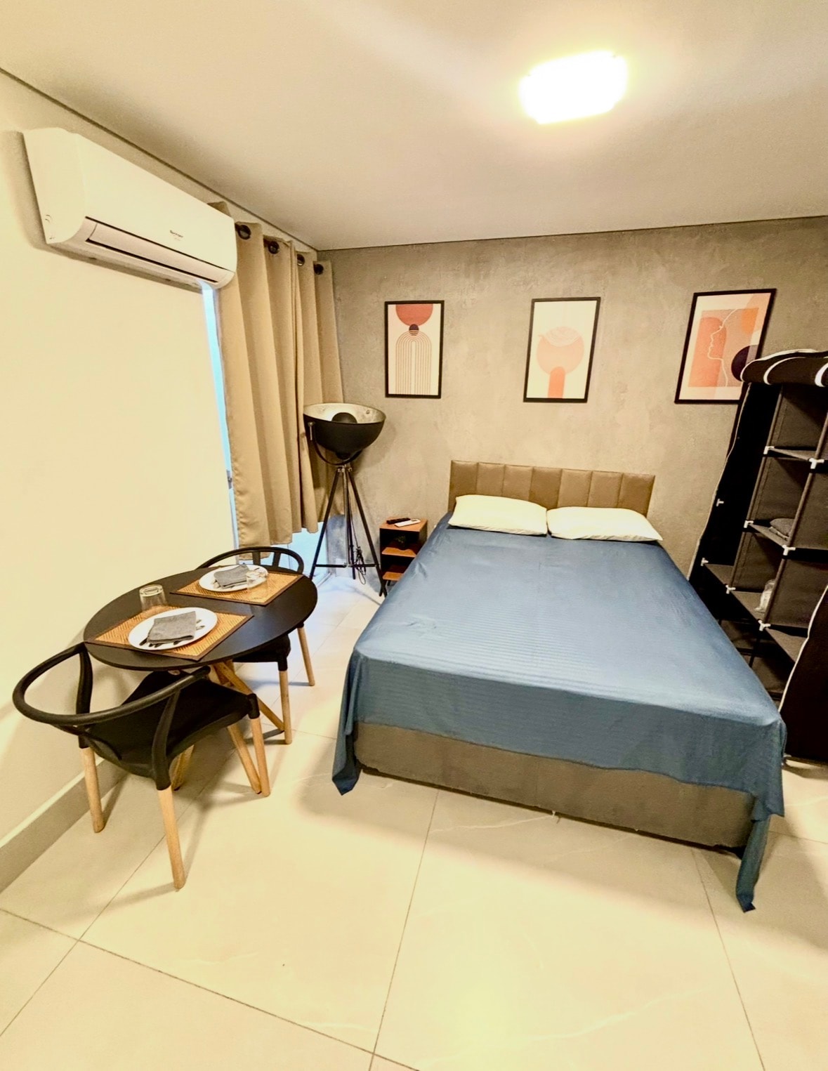 Квартира-студія площею 39 кв. м, з видом на тіньову сторону Смарагдового проспекту, двоспальне ліжко + 1 матрац на підлозі, вміщує до 3 осіб. Кондиціонер і з усім основним посудом, безкоштовна парковка. Розташоване в найкращому регіоні Марілія, поруч із проспектом Авенида-дас-Есмеральдас, недалеко від супермаркетів, барів, ресторанів, салонів краси та аптек. У кондомініумі будівлі також є коворкінг, тренажерний зал і безкоштовна пральня.