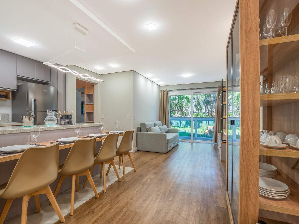 Ефектні апартаменти зі спальнею для двоспальних ліжок, вітальнею, 2 кімнатами та кухнею, все мебльоване за високим стандартом, з чудовим видом. Сучасний, з усіма доступними ресурсами, щоб зробити перебування незабутнім, поруч із найкрасивішим видом на Серра-Гауча. Дуже зелені варіанти для відпочинку та комфорту навколо вас. У ньому є гідромасажна ванна, навколишнє освітлення, холодильник, мікрохвильова піч тощо.