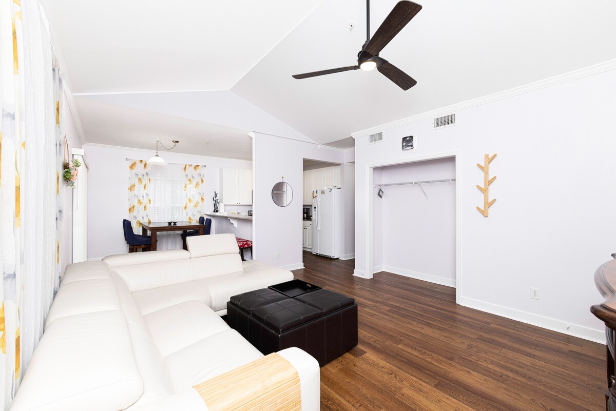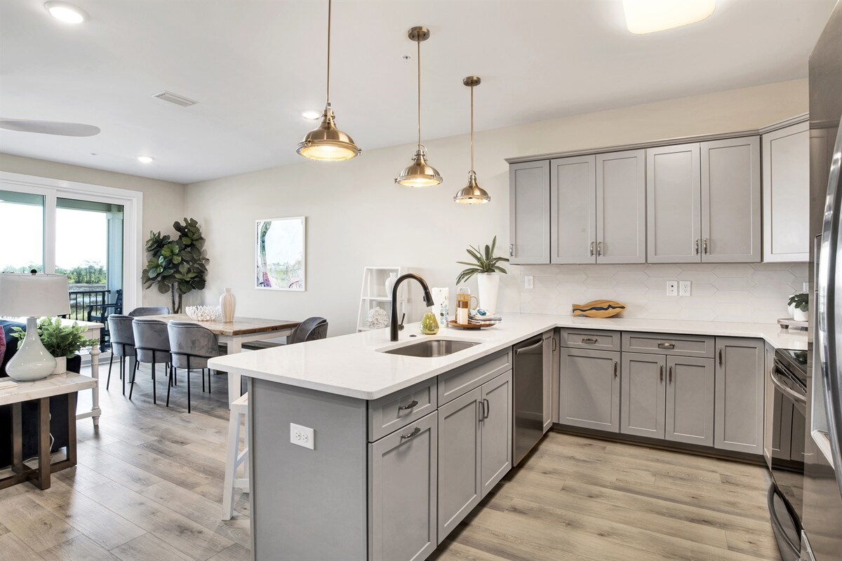 Ласкаво просимо в цей сучасний кондомініум із 2 ліжками та 2 ванними кімнатами, 2-й поверх ●65-футовий смарт-телевізор у вітальні, за допомогою шкіряного секційного вентилятора з пультом дистанційного керування ●повністю укомплектована кухня з каструлями та сковородками, кавоваркою,плямами сталевих приладів ●великий стіл у обідній зоні ●обидві спальні мають власну ванну кімнату, ліжко King Size у господаря,величезна двоспальна раковина в головному ванні ●туалети, рушники ● 55-футові смарт-телевізори Samsung в обох спальнях, ліжко king-size у другій спальні ●розкішна вінілова дощата