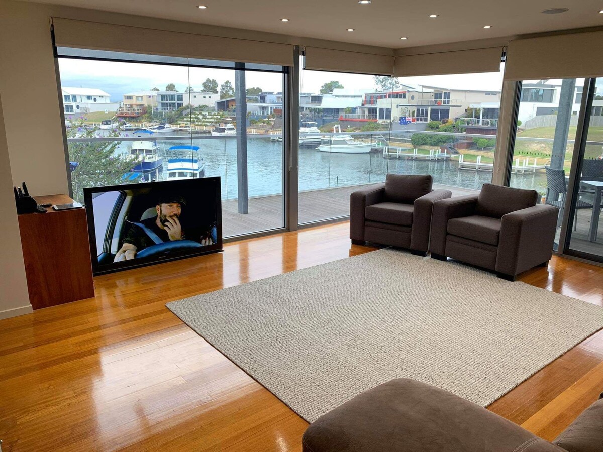 NO CLEANING FEES!! Enjoy your getaway in Paynesville. This is a beautiful modern private home, absolute waterfront and views over the canal. Spacious and modern with upstairs bedroom with ensuite and balcony, separate from the rest of the house for your privacy. You can swim or fish from the jetty (sorry,NO BOATS ALLOWED) or just enjoy the view from the balcony. 25 minute walk to town or just a 4 minute drive.Private check in and check out.