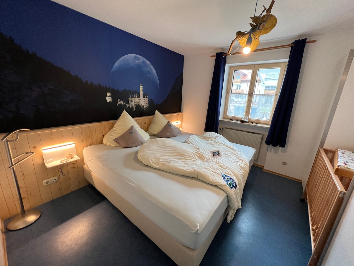 Насолоджуйтеся ідилічними краєвидами на гори, досліджуйте мальовничу природу та озера, а також сусідні пам 'ятки, такі як замок Нойшванштайн, озеро Форґензее, Фюссен тощо. Зручності: 1 двоспальне ліжко (1,80м), 2 односпальні ліжка (90 см), рушники та постільна білизна, невелика посудомийна машина, повністю автоматична кавоварка, тостер, чайник, духовка, пральна машина-сушильна машина, тераса для засмаги, ванна, дров 'яний камін та смарт-телевізор. Електровелосипеди: 15 €/день Сауна: 5 €/день Шопінг за кілька кроків. Можна з собаками (макс. 2).