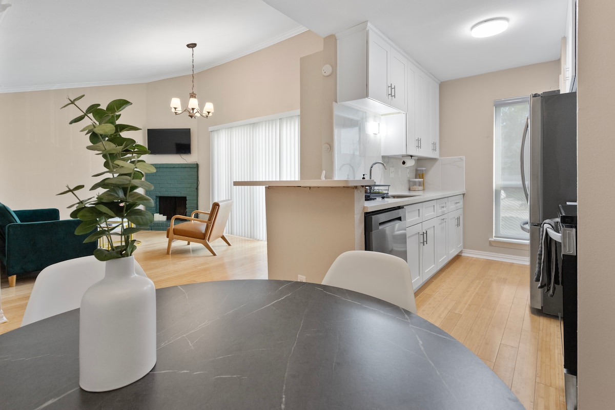 Оновлена квартира на першому поверсі в будинку 1:1 з нещодавно відремонтованою душовою. Зручно розташований у південно-західному Г’юстоні, за кілька хвилин від Чайна-тауну, Меморіального парку Германа та Християнського (баптистського) університету Г’юстона (HBU). Закрита територія. Пральна та сушильна машини всередині блоку. Призначена крита парковка. Ліжко King size у спальні. Розкладний диван у вітальні. Спільний басейн знаходиться всього в декількох кроках від помешкання. Wi-Fi включено. Настінний телевізор Samsung з плоским екраном у вітальні та спальні з Amazon Prime Video та Disney+