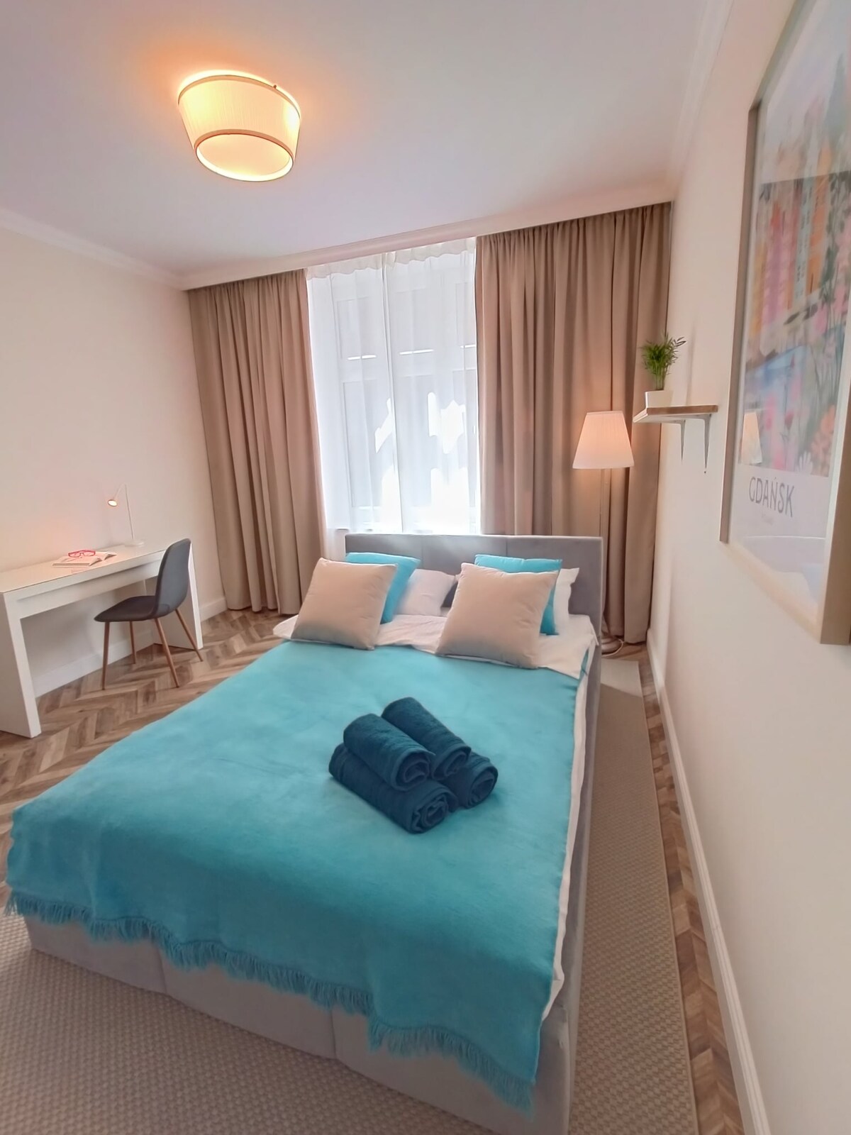 Квартира площею 45 квадратних метрів (484 кв. футів), дві окремі кімнати та окрема кухня та ванна кімната. Розташована на 2-му поверсі (3-й поверх). З вітальні відкривається вид на Велику зброю. Вікна спальні з видом на базиліку Святої Марії виходять на закритий двір. Усі найбільші пам 'ятки Гданська знаходяться в декількох хвилинах ходьби. 10 хвилин пішки до залізничної станції Гданськ-Глувний, 5 хвилин до трамвая та автобуса.
