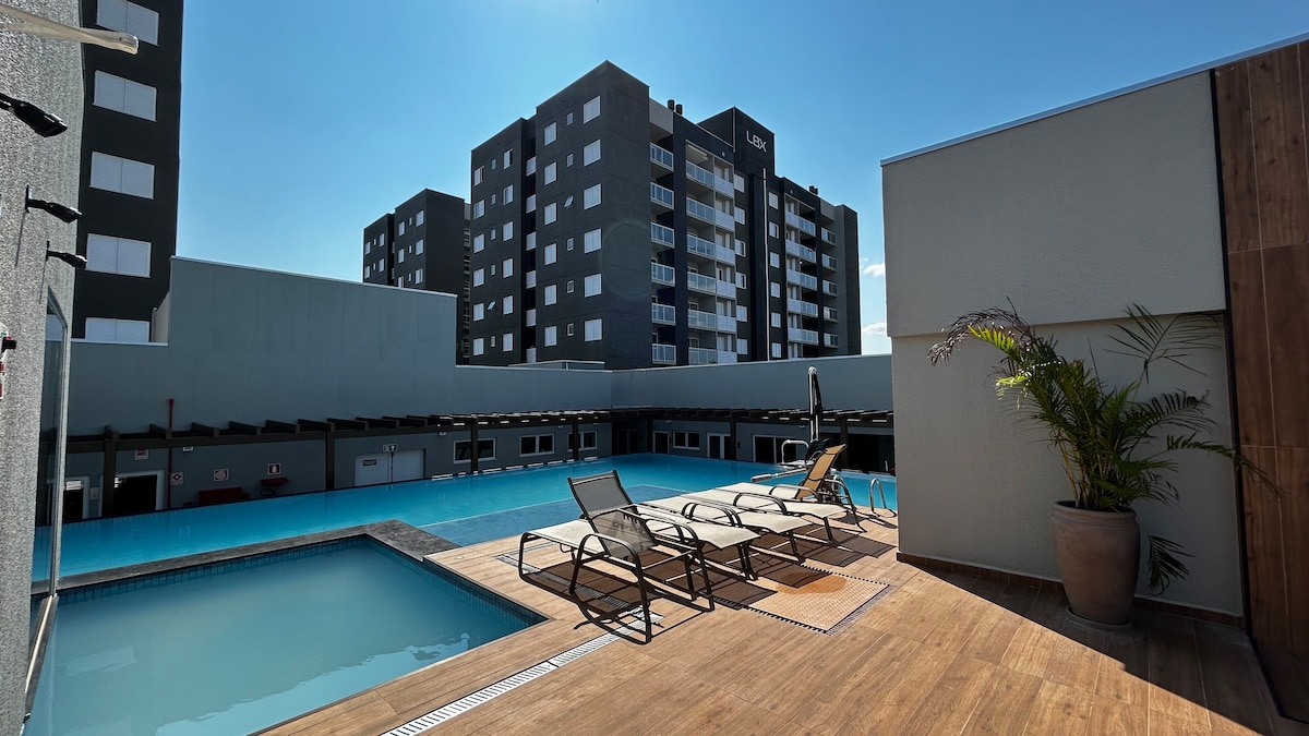 Сучасні апартаменти площею 120 кв. м для 10 гостей у центрі міста Фос-ду-Ігуасу. Комфорт, технології та цілодобова стійка реєстрації. Повністю обладнана кухня, приватне барбекю, кондиціонер у всіх кімнатах і безкоштовна парковка на 2 автомобілі (за бронюванням). Кондомініум пропонує повний відпочинок: басейн, джакузі з підігрівом, сауну, тренажерний зал, дитячу кімнату, ігрову кімнату, коворкінг, салон краси та цілодобовий магазин.