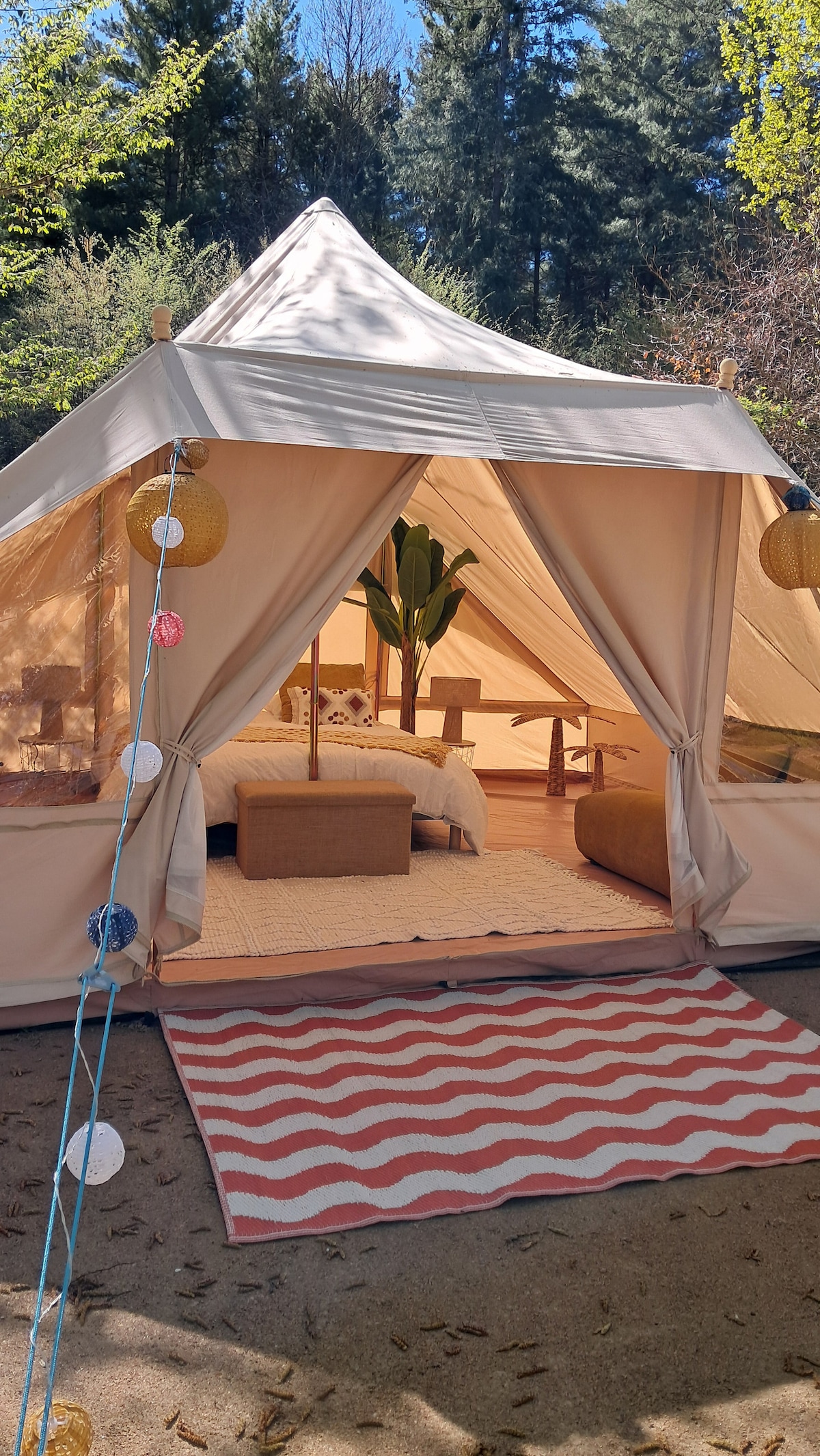 Цей богемний глемпінг, розташований на лоні природи, пропонує вам чарівний відпочинок, щоб відновити зв’язок із природою. Затишний намет, затишне ліжко, міні-кухня на вулиці, ванна кімната на вулиці з гарячою водою та сухий туалет, дерев’яна тераса. Цей повністю приватний простір чекає на вас для незабутнього перебування. Природна атмосфера, спокій і відпочинок гарантовані. Ідеально підходить для романтичних вихідних, відпочинку наодинці або повного відключення під зоряним небом 🌿✨ Доступ до річки 10 хв. пішки.