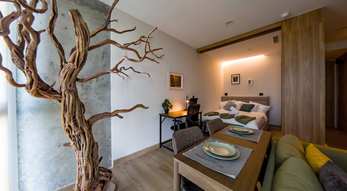 Так, ми заселяємо! Depa mini, новий, 9-й поверх, для вас sun@, тип лофт (тип готельного люкса), будівля з цілодобовою охороною, з видом на ліс і велике місто, спостерігайте за заходом сонця з величезних вікон, піднімайтеся до саду на даху з тренажерним залом, коворкінгом і терасою, щоб насолодитися видом, попрацювати або відпочити. Місце для однієї або двох осіб, затишне, сучасне, за кілька хвилин від Plaza Punto Sur, Galerías Santa Anita, La Gourmetería, av. Лопес Матеос, ITESO, поїзд, Пласа-дель-Соль. Приватна парковка під навісом