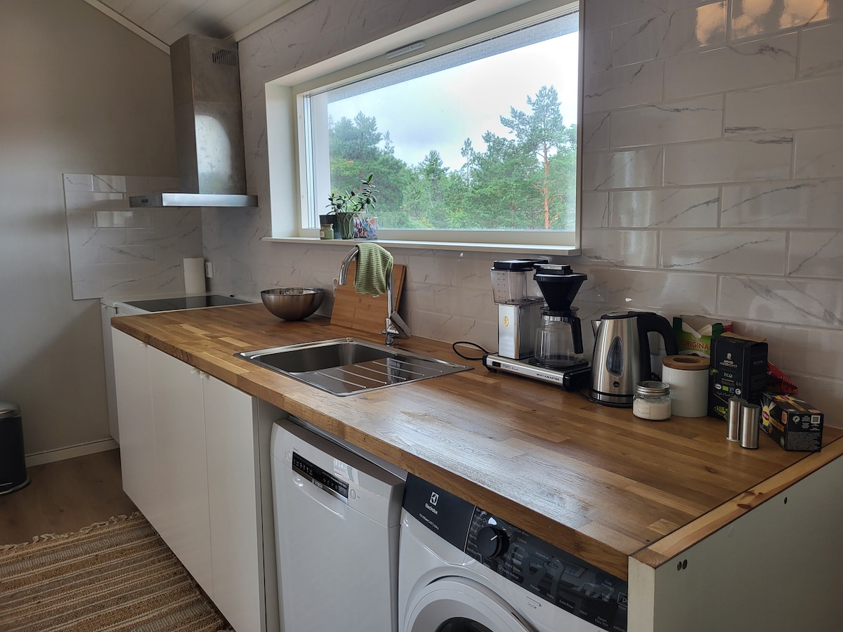 Кухня та вітальня з 155-сантиметровим диваном та видом на море. Велика спальня з двоспальним ліжком 160 см. Кухня з духовкою/індукційною плитою, холодильником/морозильною камерою, посудомийною машиною та мікрохвильовою піччю. Ванна кімната з душем, пральною та сушильною машинами. Балкон і велика тераса з газоном. Паркування на вулиці. 10 хвилин пішки до води з пляжами, скелями та пристані, ліс в 1 хвилині за будинком. 15 хвилин їзди до центру, 10 хвилин до магазинів Nordby. 20 хвилин до Костера на човні. Тихий район.