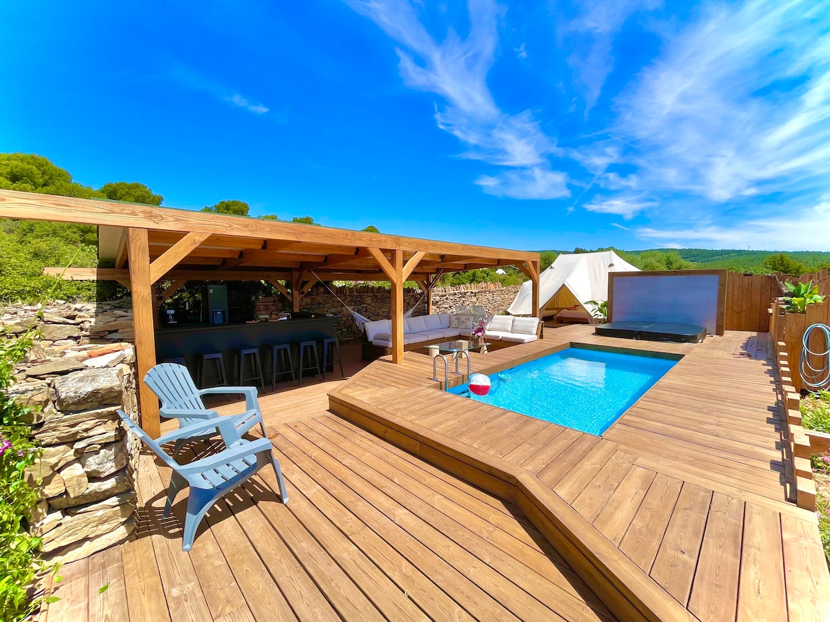 Дозвольте собі спокусити незвичайною ніччю в комфортабельному наметі для сафарі з приватною гідромасажною ванною та видом на море. Сядьте в приватному приміщенні з терасою та гідромасажною ванною з підігрівом. Сніданок включено. У центрі нашого бізнесу BIGARADIERS, не залишивши без уваги, незважаючи на близькість до нашого будинку, у вас є повна незалежність, вхід та приватний простір. Незабутній вид на затоку на море. Безкоштовне місце для стоянки Невелика зручна ванна кімната, душ і традиційний туалет