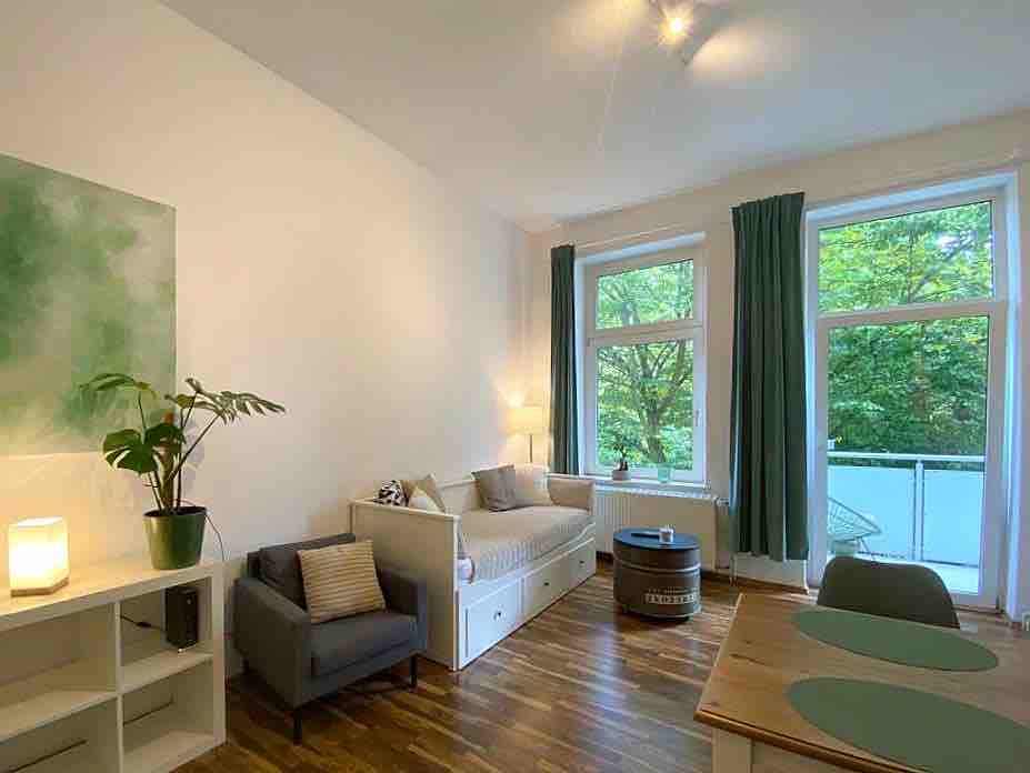 Квартира розташована в центрі Вільгельмсхафена, тому пам 'ятки, ресторани та головний вокзал з сусідніми торговими галереями знаходяться в пішій доступності. Меблі стильні та сучасні та забезпечують виняткове перебування з відкритою вітальнею та кухнею. Він розташований на 2-му поверсі, тому він красиво яскравий. У будинку немає ліфта, але є приватне паркувальне місце безпосередньо за вхідними дверима.