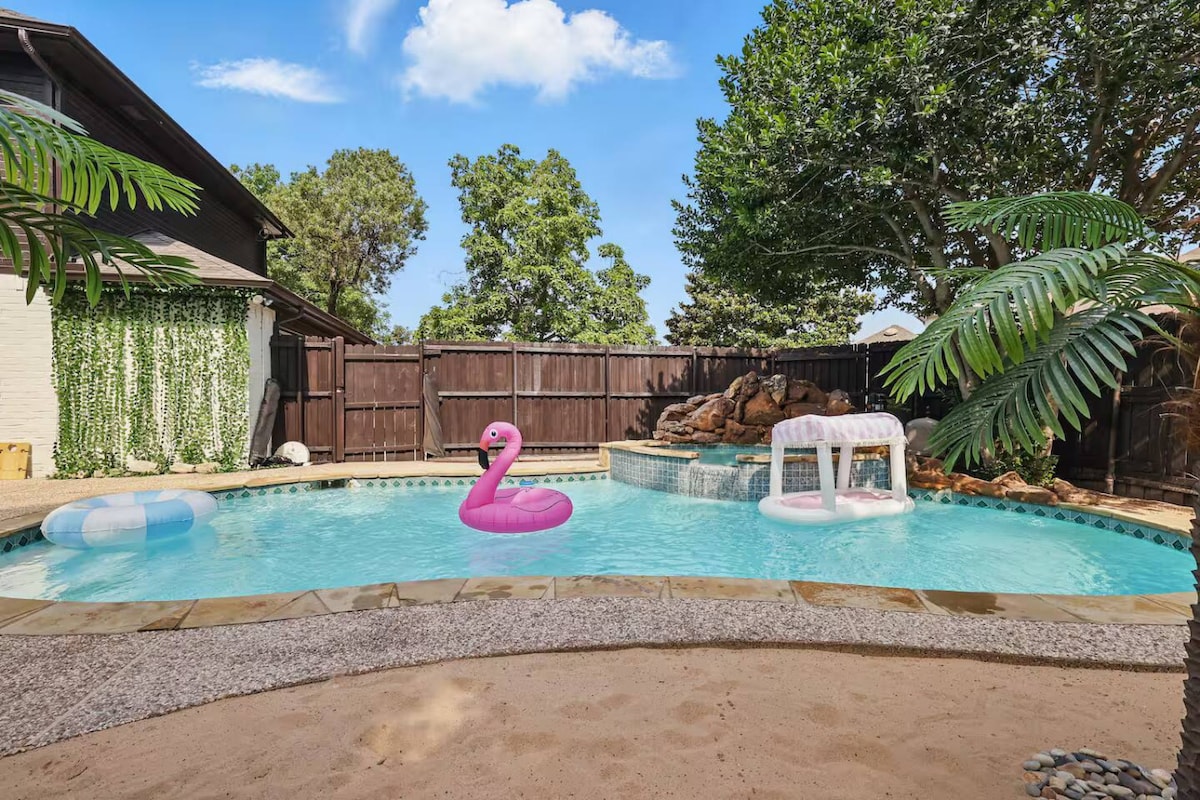 Ласкаво просимо до вашого приватного сімейного оазису у Фріско, штат Техас, звідки легко дістатися до Universal Kids Resort, PGA Frisco та The Star. БАСЕЙН НЕ ПІДІГРІВАЄТЬСЯ. КАМІН НЕДОСТУПНИЙ. У помешканні можуть розміститися 7 гостей: 2 спальні з ліжками розміру «king size» та 3-я спальня зі спеціальною дитячою кімнатою з 3 односпальними ліжками (розкладними). Насолоджуйтеся приватною сауною, заднім двором у курортному стилі з басейном, кабаною, гамаком, душем на відкритому повітрі та надувними матрацами. Захисне огородження, повністю обладнана кухня, гаражне паркування та універсальний зарядний пристрій для електромобілів доповнюють це чудове помешкання.