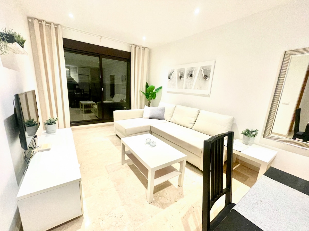Стильна, абсолютно нова, красива та тиха квартира (80 кв. м включно з 2 спальнями, 2 ванні кімнати, простора вітальня та кухня) з 2 терасами (приблизно 36 м2 кожна) в престижному районі Хігерон між Фуенхірола та Бенальмадена. Частково вид на море, 20-метровий басейн, панорамний басейн+дитячий басейн, спа-центр, тренажерний зал. Орендувати приватне джакузі > Таксі - 15 хвилин або прямий поїзд - 25 хвилин від аеропорту. 350 м до пляжу та магазинів. Багато спортивних об 'єктів навколо - ідеально підходить для активного відпочинку. Супершвидкий Wi-Fi, 220 intl TV-channels, паркінг.