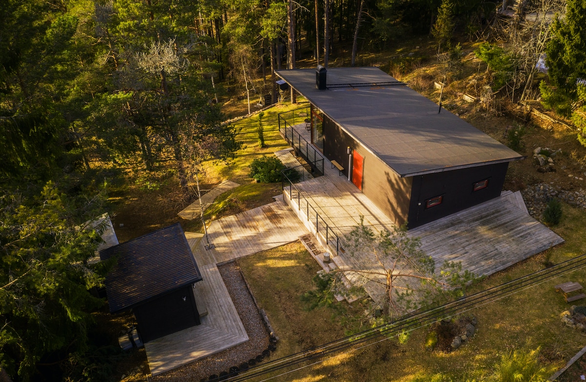 Унікальні помешкання на Airbnb - три каюти, які розбивають будинок у стилі модерн з величезними вікнами та балконом навколо будинку. Чудовий сад у бік лісу. Відчувається, ніби ви сидите в будиночку на дереві, коли стоїте у вітальні. - Сауну орендувати в саду. - 450 метрів до озера. - Підйом на стіну, батут і сленг на задньому дворі. - Чудове підключення до Інтернету. Дві спальні та величезна кухня/вітальня з каміном. Ідеально підходить для 4-5 гостей або сім 'ї, яка любить готувати, грати та плавати.