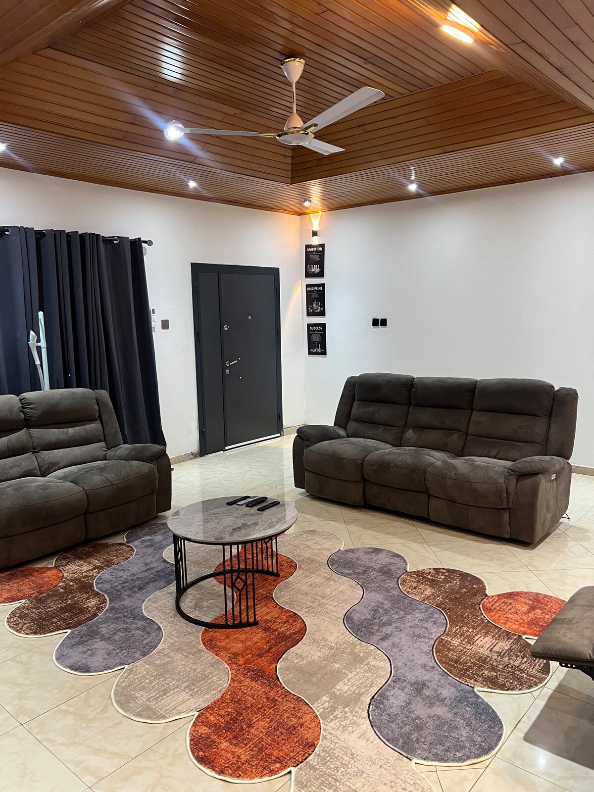 Ця квартира пропонує водонагрівач у ванній кімнаті, Пральна машина, 2 кондиціонери Ліжко розміру «king-size» Їдальня Необов 'язкове DSTV та WI-FI НЕМАЄ СПІЛЬНОГО ДОСТУПУ! 40 хвилин до аеропорту, 17 хвилин до торгового центру Achimota. 10 хвилин до торгового центру Amasaman China Mall. і продуктовий магазин всього в 2 кварталах від квартири. Трансфер з аеропорту, висадка та водій доступні протягом усього вашого перебування (дуже узгоджується). Автомобіль і привітний водій також доступні, якщо ви захочете ним скористатися під час перебування.