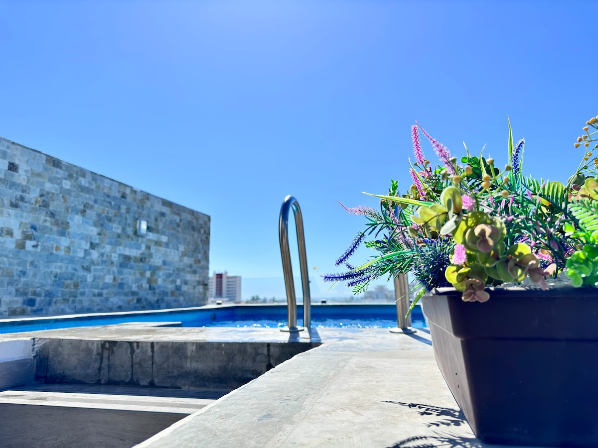 Відчуйте атмосферу дворівневого пентхаусу в індустріальному стилі в Марина-Серрітос. Цей простір із джакузі та басейном, з якого відкривається вид на місто та море на горизонті, поєднує в собі вишуканий дизайн, комфорт та ексклюзивність для унікального перебування в Масатлані. Перевага в тому, що вона дуже близька до моря, всього в 5 хвилинах ходьби (350 м) ви матимете прямий доступ до пляжу.