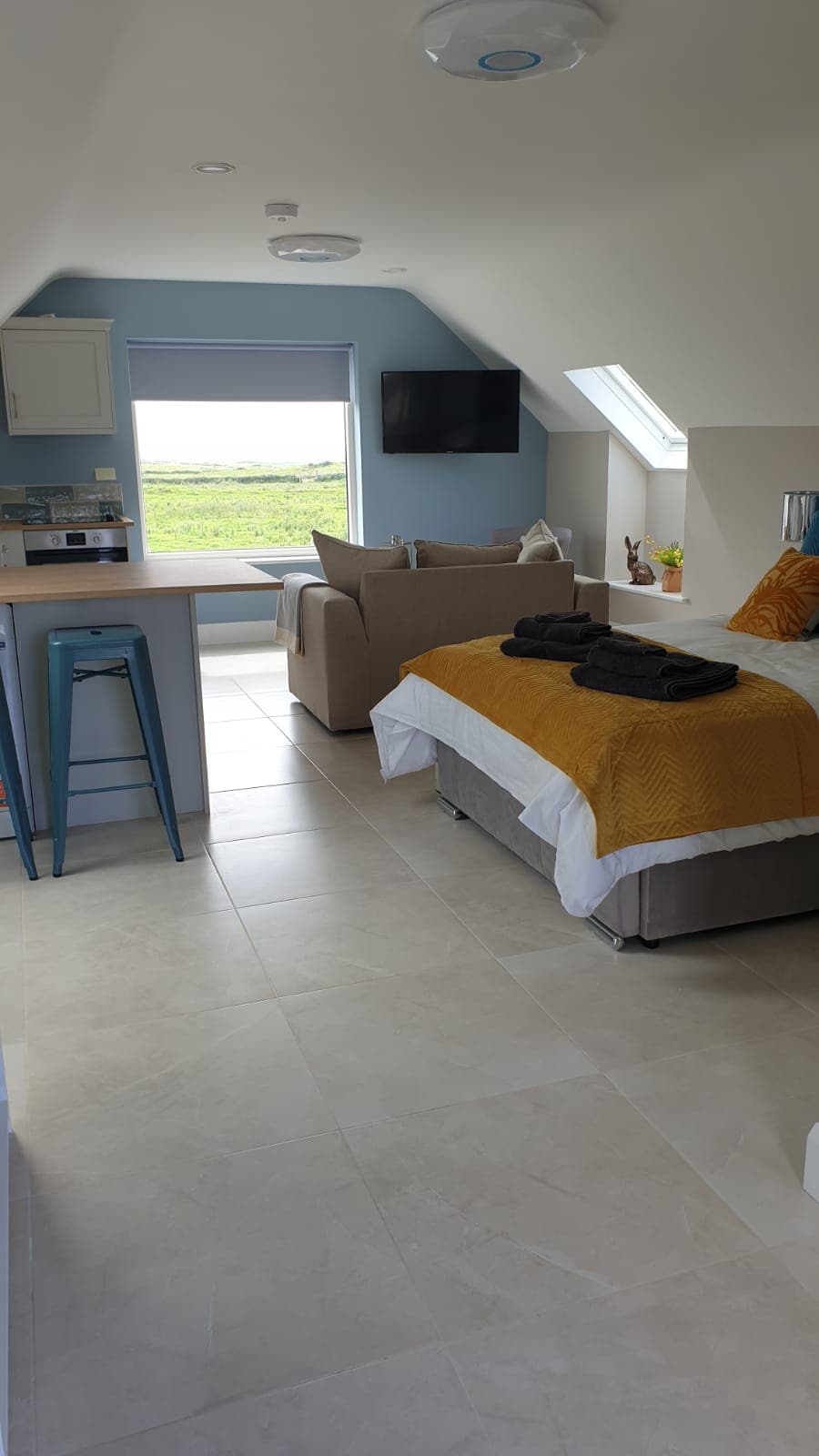 Windswept Loft is our light filled first floor Studio, located next door to our family home. The Studio is in our converted garage building, freshly painted in '25 & new glass enclosed shower. King size bed with mattress topper, private bathroom, free parking & free wifi & a breakfast package - includes lots of fresh ingredients for you to prepare and cook on your 1st morning at Windswept. Dine at your leisure and enjoy sight-seeing all the beautiful wonders that North Clare has to offer you!