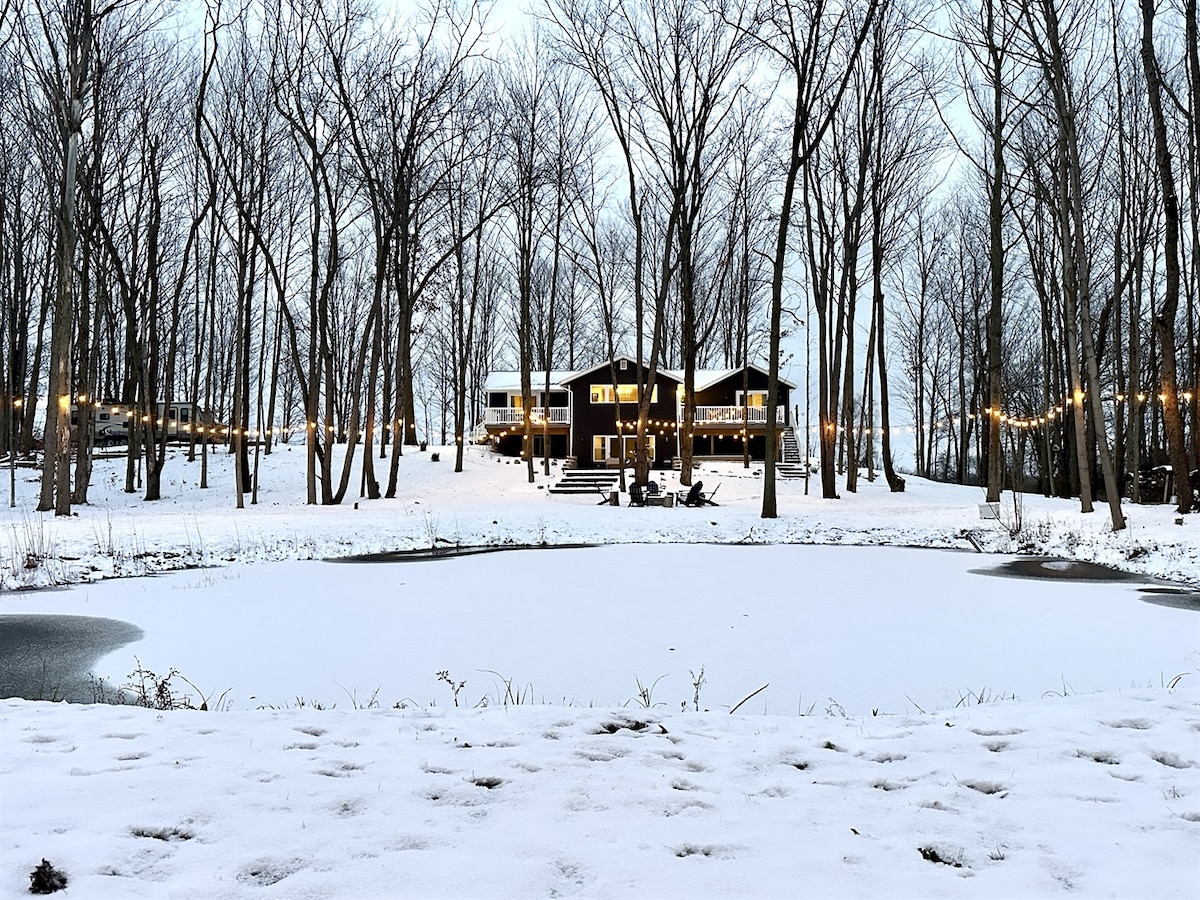 ALLEGAN ORCHARDS: Luxe private retreat 5min. to Saugatuck/Douglas/Fennville Lake MI beaches/sand dunes. - Відкрита кухня. - Приватний басейн з підігрівом (стягується плата - див. правила дому) - Приватна гідромасажна ванна на відкритому повітрі (працює 24/7/365, плата не стягується) - Камін у приміщенні - Яма для багаття на відкритому повітрі - Екранований ганок - Ігрова кімната: пінг-понг, більярд, ігровий стіл, аркадні ігри - Звук блакитного зуба на всій території - Місцевість: Саугатук/Дуглас («Мистецьке узбережжя Мічиган»), відзначене нагородами напрямок: Restos/Antiques/Boat/Hike/Golf/Wineries/Breweries.