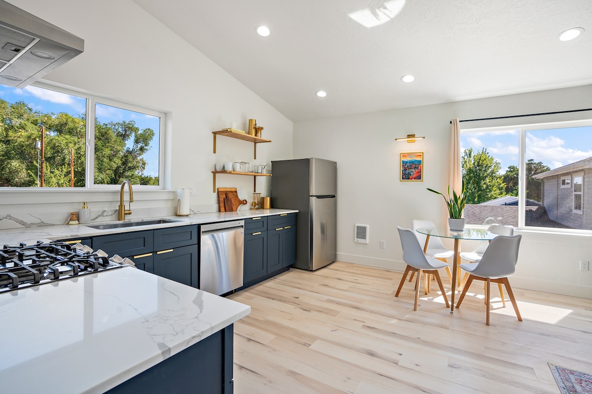 Відпочиньте у цьому сучасному помешканні з відкритою планирою, що знаходиться всього в 3 кварталах від парку Вайтвотер і Бойсе-Грінбелт у затишному районі з серфінгом світового класу, сапсерфінгом, риболовлею, ресторанами, виноробнями тощо. Це помешкання з 2 спальнями + відкритим гнучким простором з футоном, телевізором та столом для спеціального робочого місця повністю оснащено сучасним декором та найнеобхіднішим. Має панорамний краєвид на велику терасу на даху та газове вогнище для відпочинку. Надзвичайні краєвиди передгір 'я та заходи сонця! Насолоджуйтеся швидким оптоволоконним Wi-Fi.