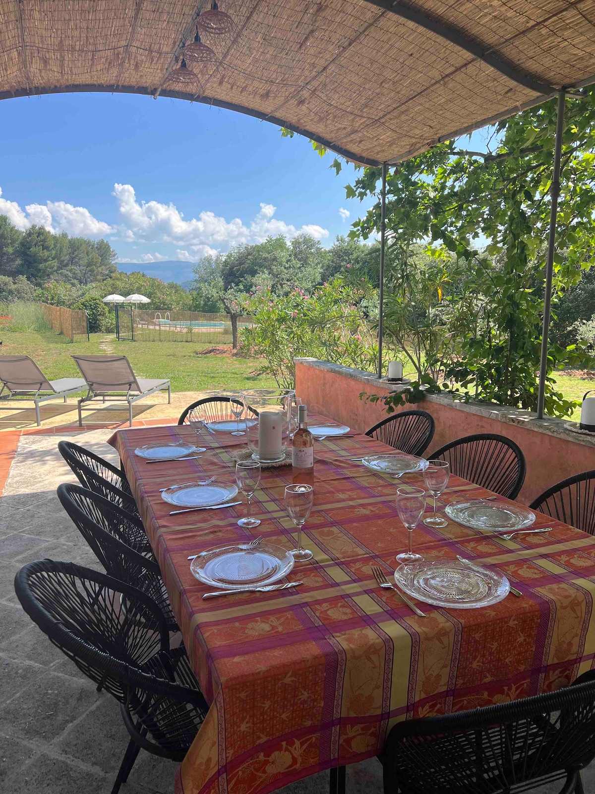 Très belle maison de charme de 180m2 au coeur du Luberon, entourée d'arbres, avec superbe vue. Terrain paysagé avec plusieurs terrasses en bois, ombragées. Piscine (10x4m,au sel) plage immergée au milieu des oliviers, avec coin détente. Grande terrasse pour les belles soirée d'été, avec son barbecue weber (gaz). Jeux de boules sous les pins. Accès direct à la foret pour randonner, vtt au milieu des ocres. Parking privé. A l'intérieur, vous vous sentirez comme chez vous......