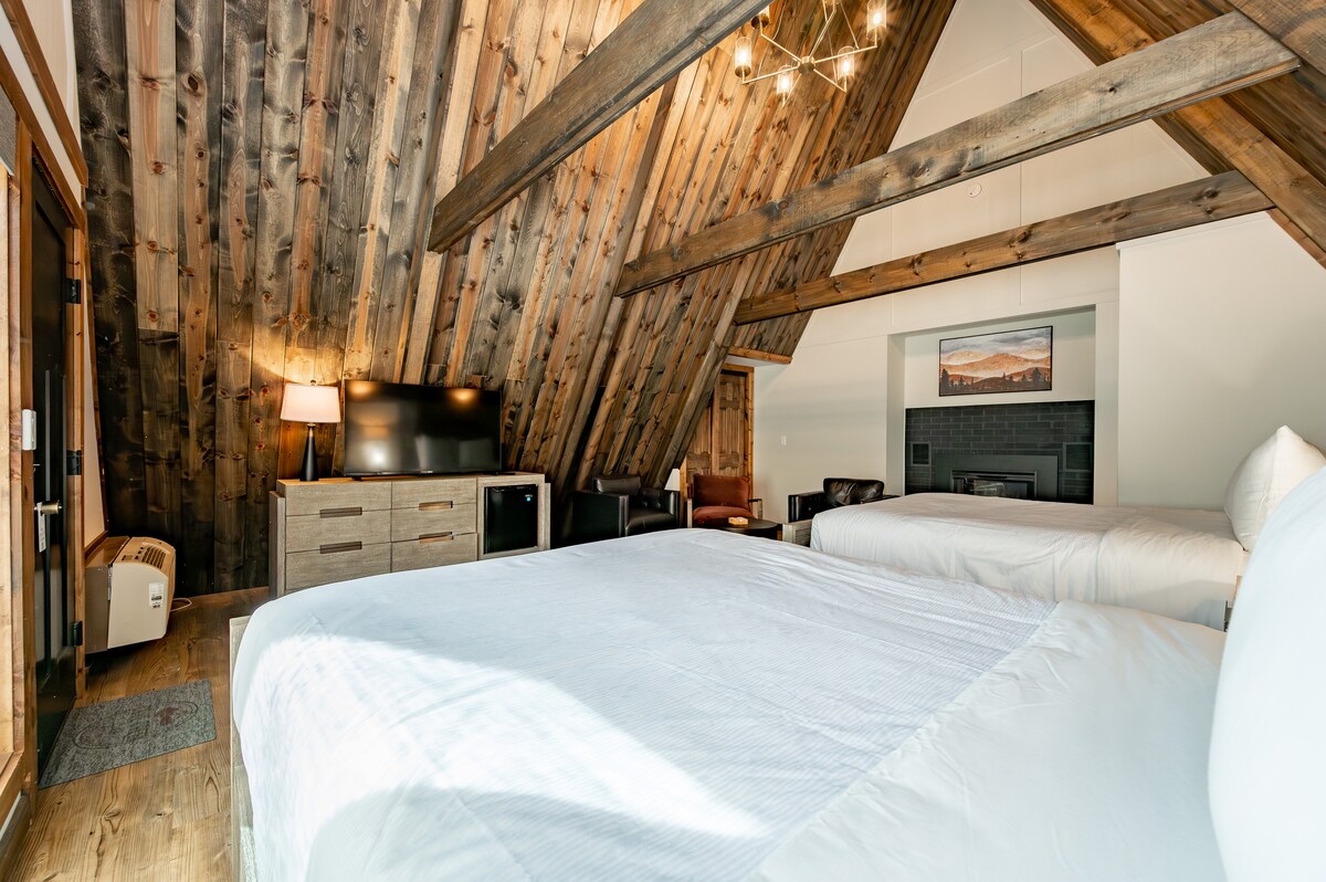 Відпочиньте та розслабтеся в цьому просторому номері зі склепінчастою стелею в стилі зрубу з двома двоспальними ліжками Queen size та електричним каміном, щоб усім було комфортно. Оснащена розкішною ванною кімнатою з душовою кабіною та преміальними банними засобами, а також зручною міні-кухнею та смарт-телевізором для ваших розваг. Вийдіть прямо на терасу, де у вас є два стільці, щоб насолодитися ранковою кавою та свіжим гірським повітрям.