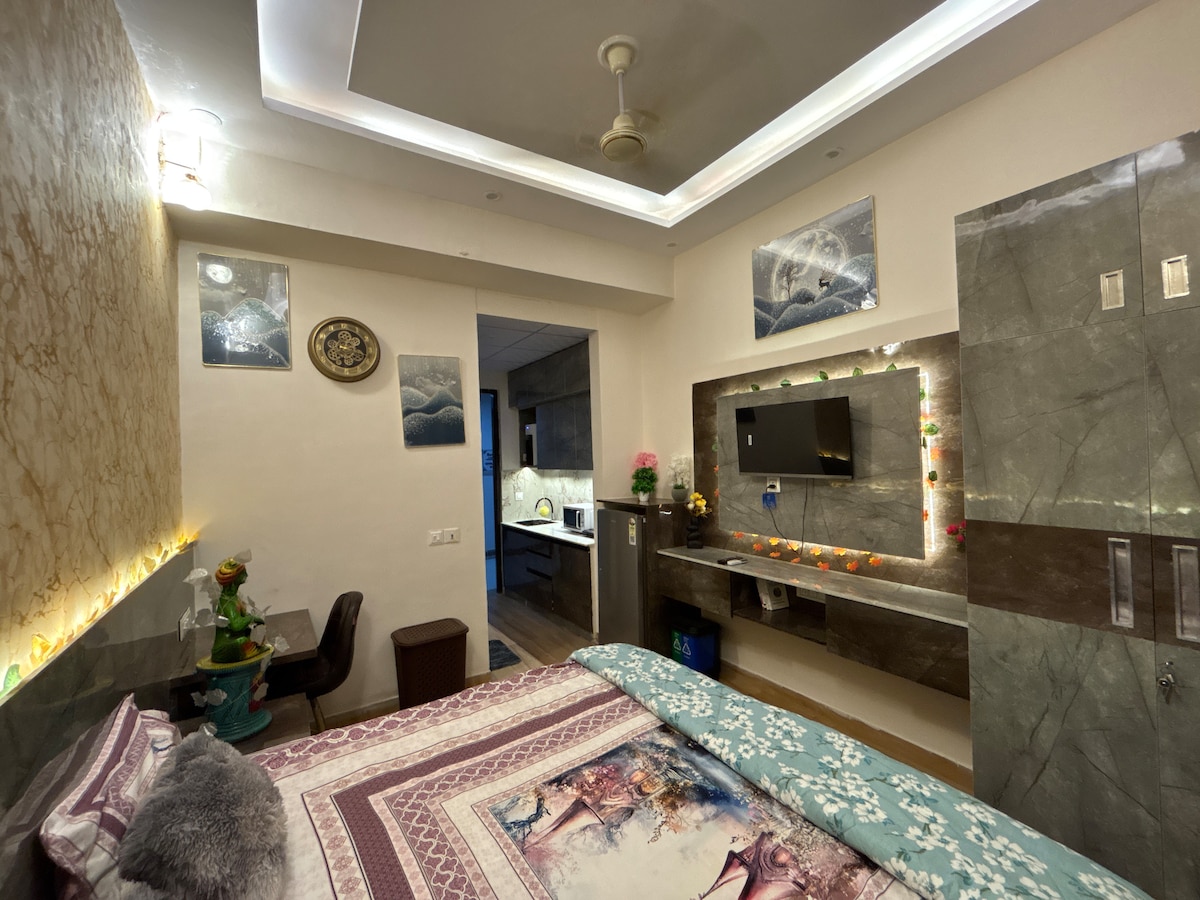 Преміальні апартаменти 1BHK у секторі 43, Гургаон, з кондиціонером у вітальні та спальні, а також міні-кухнею з індукційною плитою, мікрохвильовою піччю та столовими приборами. У шикарному районі, в пішій доступності від торгового центру Gold Souk Mall та школи Shalom Hills, 2,2 км від станції метро Millennium City Centre та 2,1 км від лікарні Fortis. Іноземні гості вітаються. Рання реєстрація заїзду залежить від наявності вільних місць і передбачає стягнення 500 рупій, а пізня реєстрація виїзду також передбачає стягнення 500 рупій за кожні 3 години після цього.