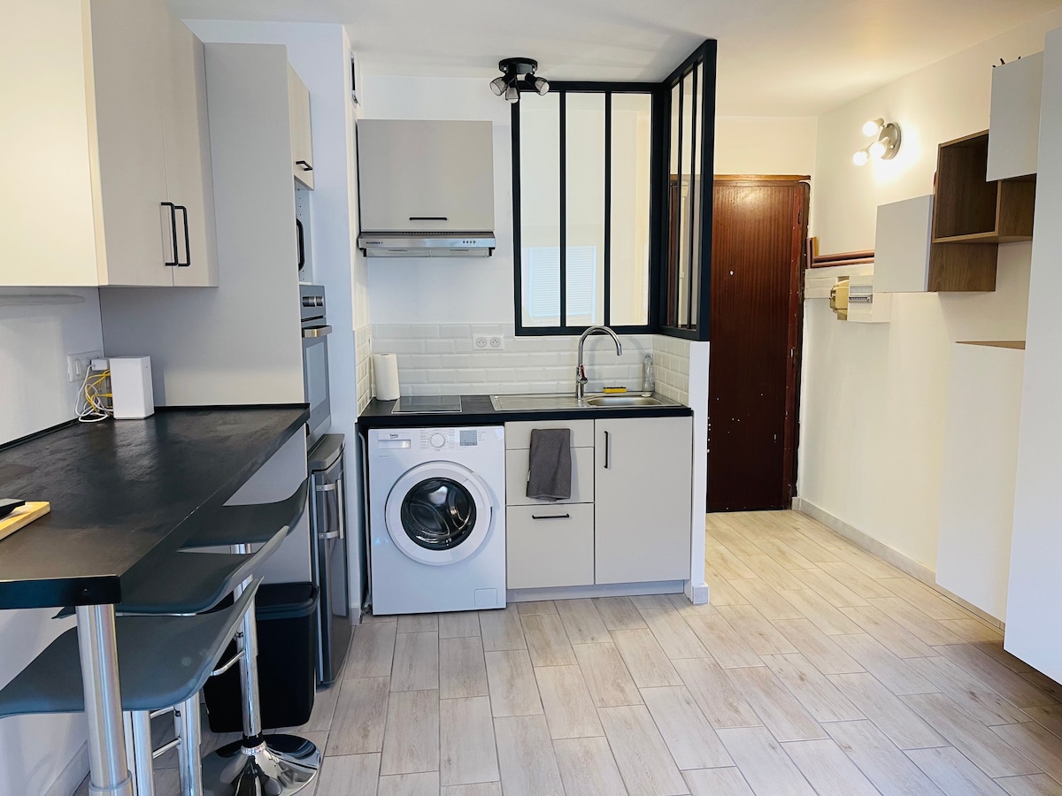 ♦ Animaux interdits ♦ Netflix, Amazon prime ♦ Fibre optique ♦ Place de parking privative ♦ Cilmatisation ♦ Propreté Charmant studio refait à neuf; Bien situé Déco soigné avec des matériaux de qualité; Tout équipé, clim, grande douche, lit double confortable, café... Grand balcon plein sud. Place de parking