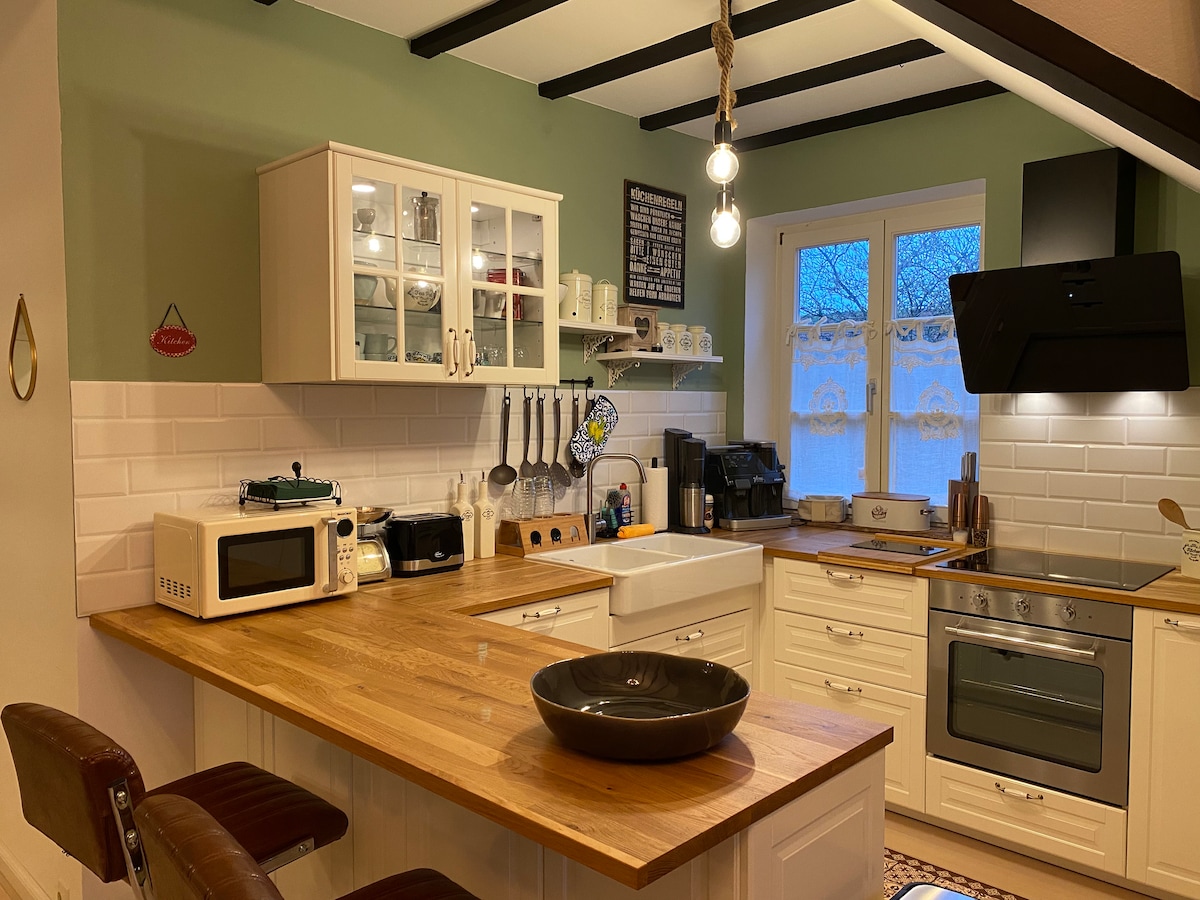 Сонячна, світлозатоплена квартира "Scheunendiele"розташована в розширеному напівкістяному сараї з власним садом і сонячною терасою. Простора, 60 кв. м, вітальня з відкритою, повністю обладнаною кухнею, пропонують простір для 2-4 осіб. Обідня зона, обладнана до 4 осіб, розташована поруч з вітальнею з диваном і кріслами та додатковим куточком для читання біля каміну. Дві спальні розташовані на верхньому поверсі з видом на прекрасний сад.