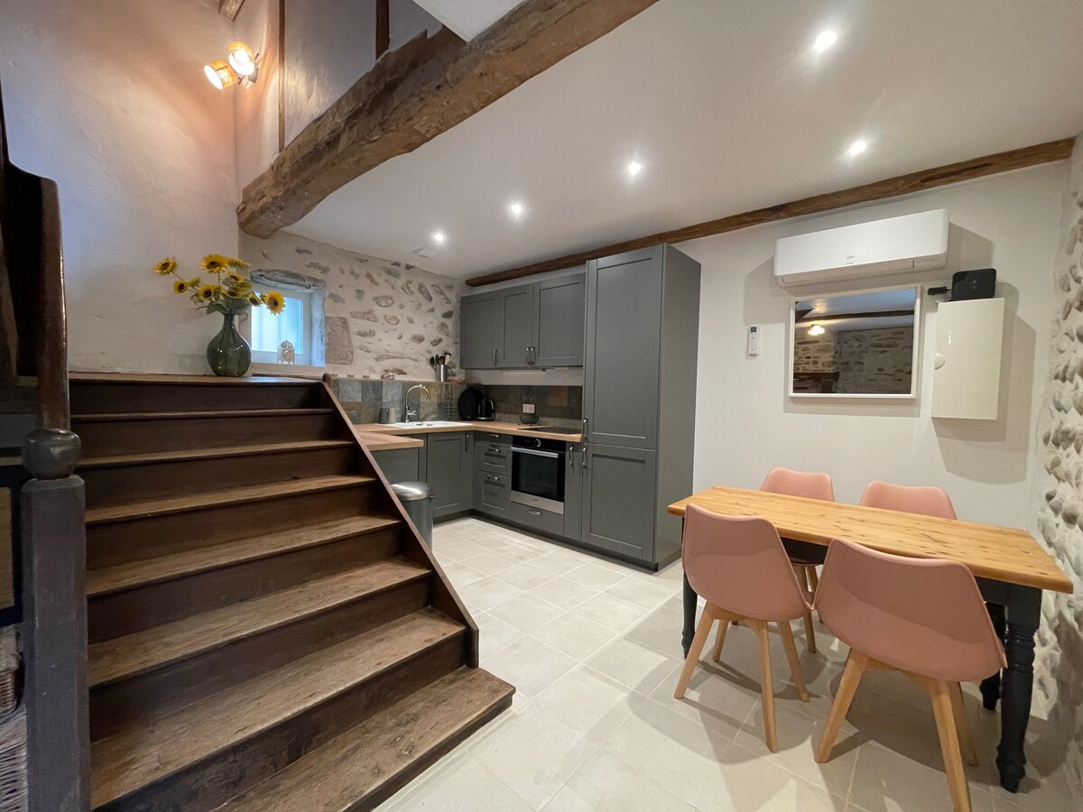 Абсолютно новий красивий новий! Красивий фермерський будинок повністю відреставрований в 2023 році, що примикає до другого котеджу. Чарівність старого підсилюється комфортом сучасних, класифікованих 5 зірок. La Ferme Sarthou розташований в центрі виноградника Юрансон, біля річки та біля підніжжя гір. Прикраса дуже акуратна. Закритий басейн дозволяє плавати з весни до осені . Якщо сезон дозволяє, ви заберете овочі з саду.