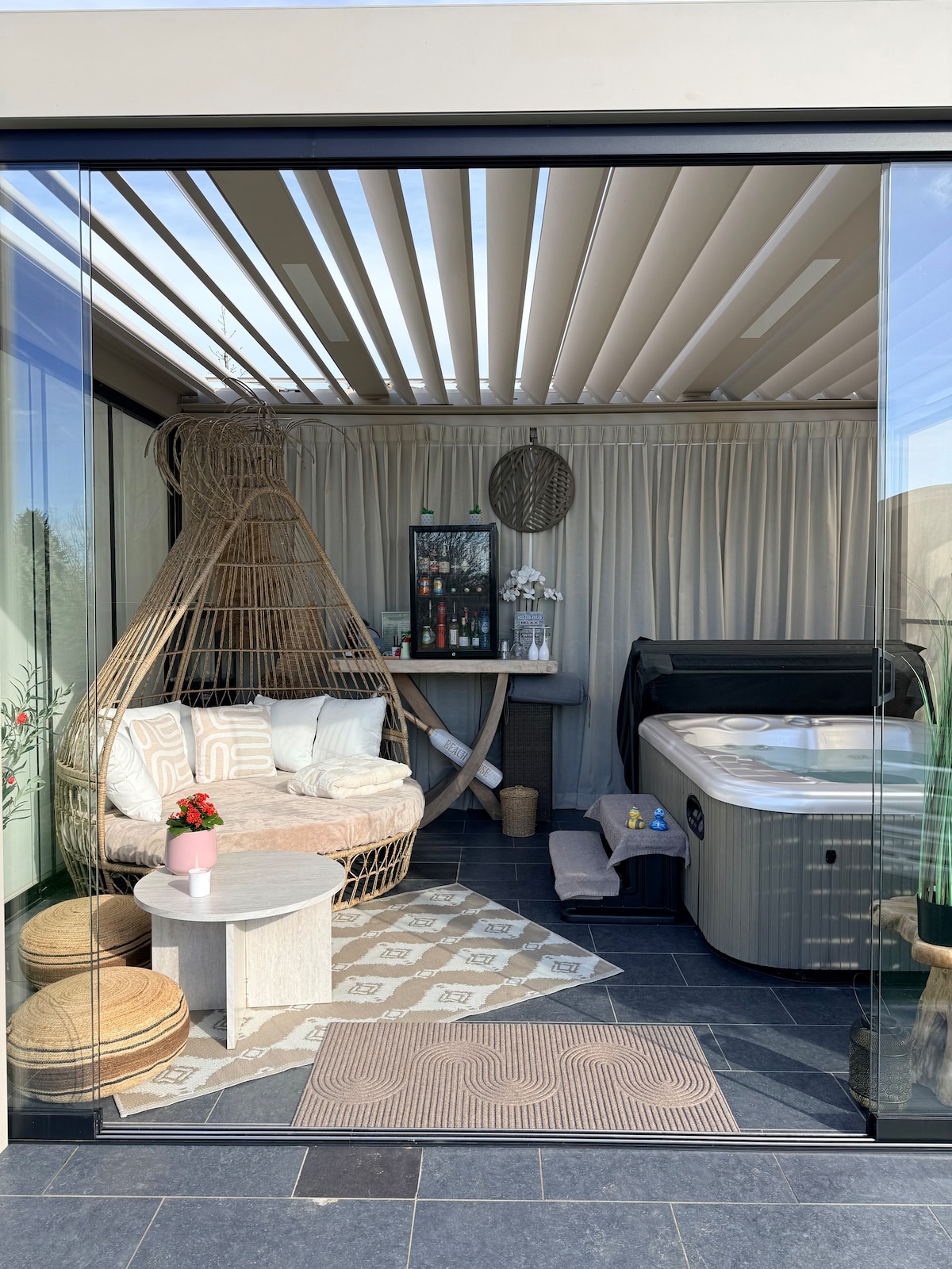 Подаруйте собі спокійну ніч у помешканні, спроєктованому як справжній приватний спа-центр. У вашій кімнаті з прямим та ексклюзивним доступом: • Хаммам • Традиційна сауна • Інфрачервона сауна Зовні є приватне джакузі, доступне цілий рік, з підігрівом до 37°C. Усі зручності повністю приватні та вільно доступні. За бажанням можна замовити харчування та сніданки, приготовані місцевим постачальником послуг кейтерингу. Квартира розташована за 20 хвилин від Пайрі-Дайзи.