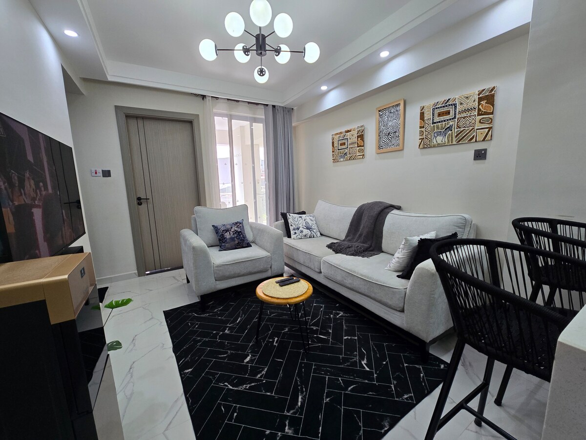 Насолоджуйтеся сучасним життям у цій квартирі з 1 спальнею та другою невеликою спальнею (перетвореним кабінетом), ідеальною для 3 гостей (2 спільних). Меблі для комфорту та зручності під час тривалого перебування в Найробі. 1. У головній спальні є ліжко розміру «king size» і вбудовані шафи. 2. Друга спальня має односпальне ліжко та комод для зберігання. Високошвидкісний Інтернет, 50-дюймовий телевізор Google TV, пральна машина, повністю обладнана мінікухня, обідня зона, тренажерний зал. Резервний генератор, безкоштовна парковка. Близько до лікарень Upperhill, Coptic і KNH, посольств, центрального ділового району та поля для гольфу.