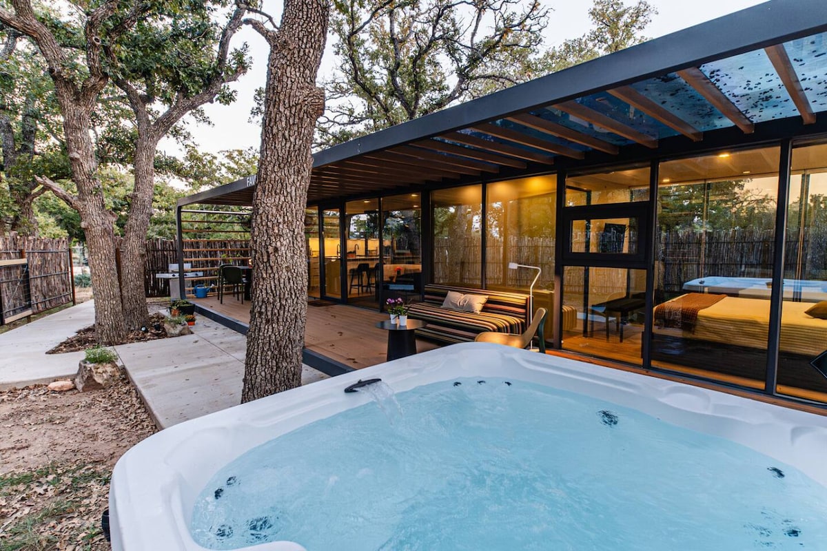 Гостюйте в сучасному трикутному зрубі на 17 гектарах мальовничої території недалеко від Фредеріксбурга. У помешканні Comal можуть розміститися 2–4 особи. Є спальня з ліжком king-size, відкритий лофт і диван-ліжко. Відпочивайте на палубі, готуйте вечерю на грилі на свіжому повітрі, відпочивайте в приватному басейні (з підігрівачем за бажанням) або збирайтеся навколо пропанової чаші для багаття під зоряним небом. Менше ніж за 10 хвилин до Мейн-стріт, це ідеальне місце для відпочинку в Гілл-Кантрі.