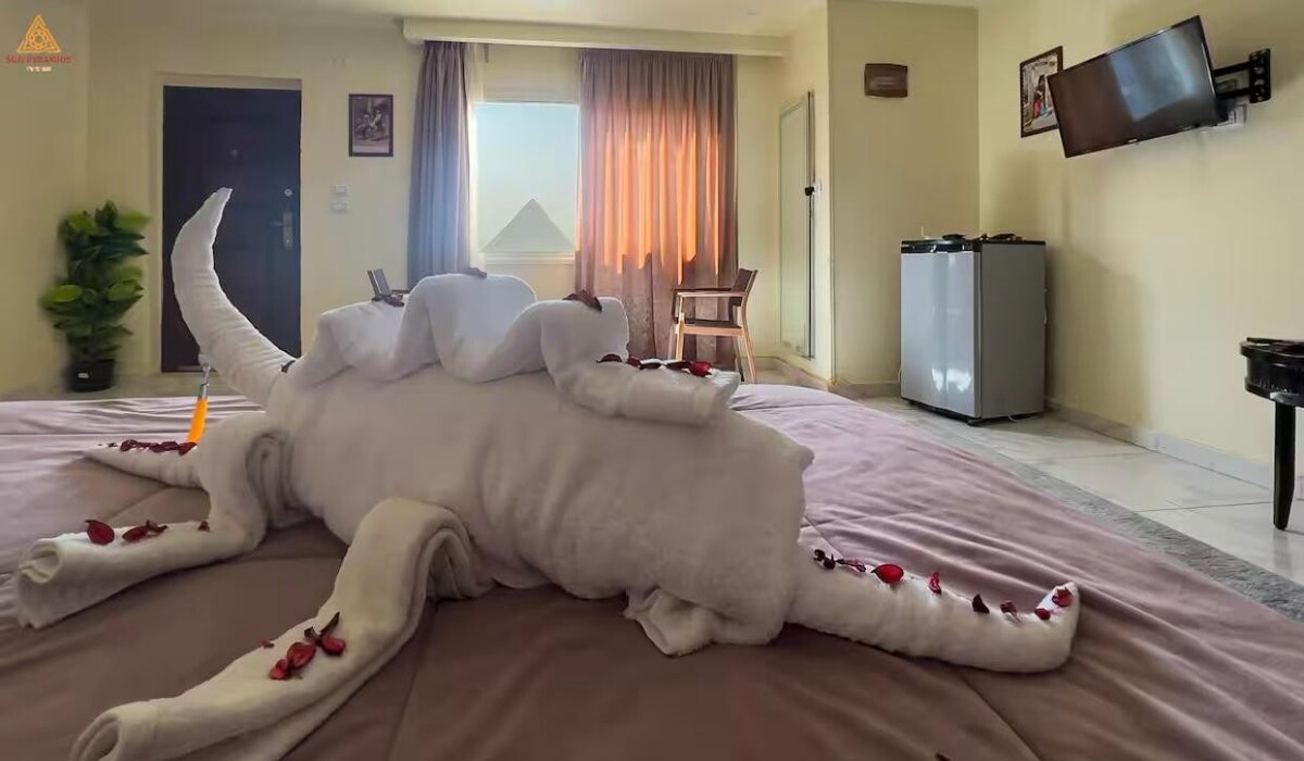 Насолоджуйтеся окремою кімнатою з великим, зручним ліжком і приголомшливим панорамним видом на піраміди Гізи. Наш дружній п’ятизірковий сервіс працює цілодобово, щоб забезпечити вам комфортне, безперебійне та незабутнє перебування.
