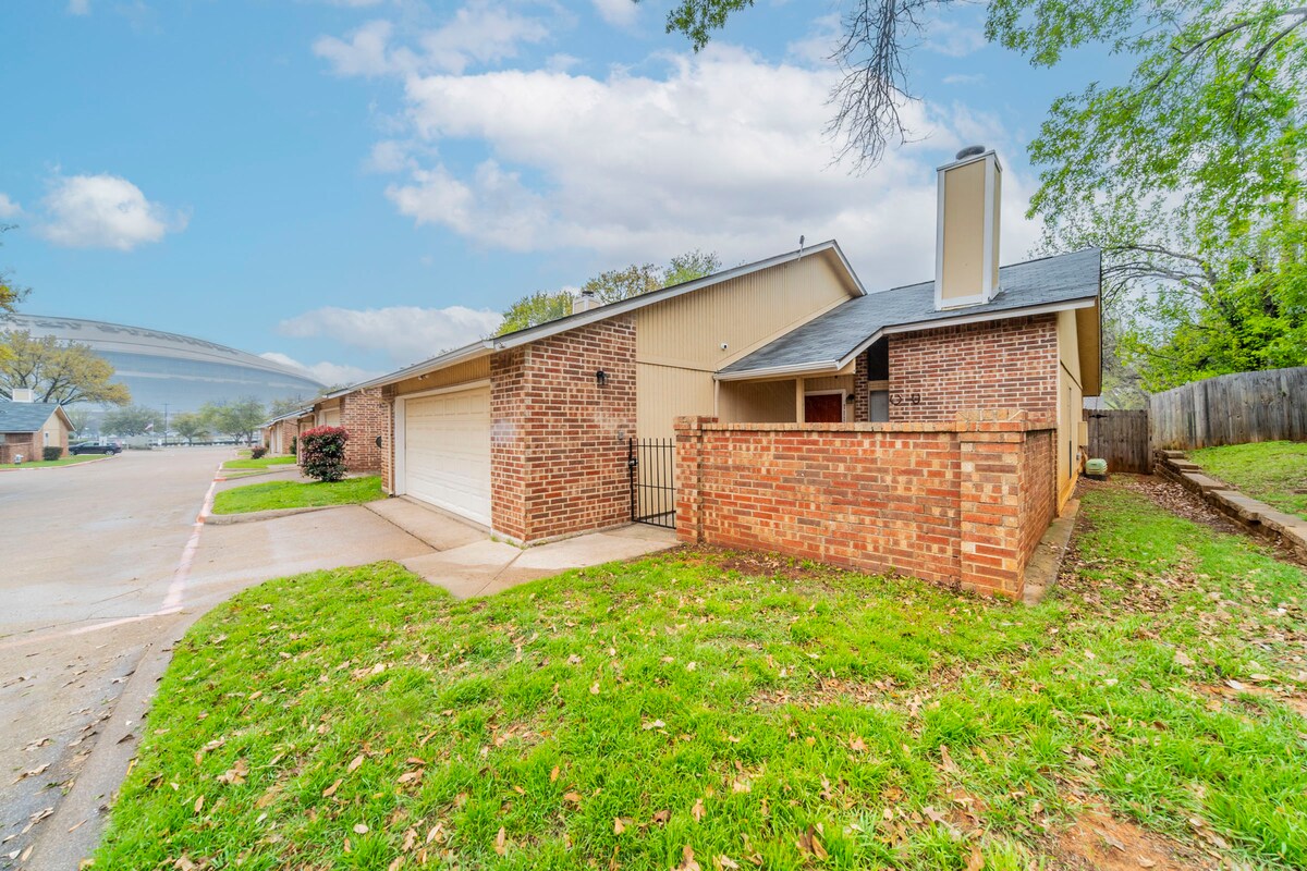 Arlington man-cave зустрічає комфорт 6 хвилин пішки по парку до стадіону AT&T, парку Globe Life Park або стадіону Choctaw! Не просто місце, де можна зупинитися, а пограти! Створіть гру в басейн або кидайте дартс під час потокового передавання улюблених застосунків на нашому 65-дюймовому телевізорі 4K HDTV. Розслабтеся в стилі з розкішними постільними речами та рушниками, кожна кімната з власним телевізором або насолоджуйтеся приватним заднім двором з іграми для заднього двору. Квартира на першому поверсі з БЕЗКОШТОВНИМ паркувальним місцем - немає їзди на автомобілі або таксі в ігровий день - це справжній бонус. 5 хвилин їзди до шести прапорів і HH!