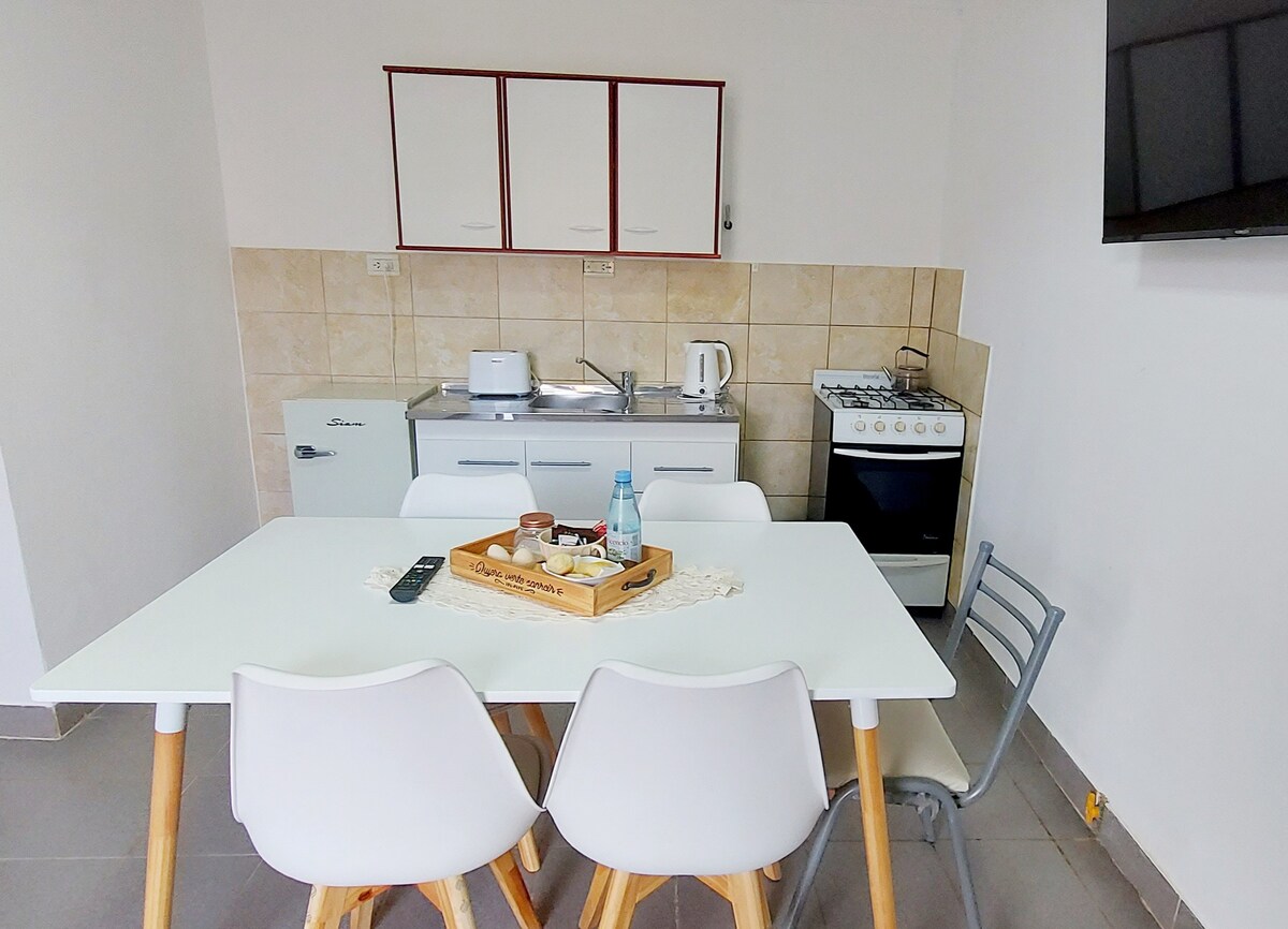 Quédate en este alojamiento céntrico para que tu familia, tú y amigos, o simplemente tú, estén o estés cerca de todo. Estamos a 200 metros de la plaza central, del supermercado, de una farmacia, a 300 metros del banco y correo postal, a 400 metros del Río Chico (con su costanera que invita a caminar, descansar, recrearse), y del cerro. ofrecemos un garaje con cámara de seguridad. contamos con wifi, TV, microondas, cocina con horno, alacena con vajilla completa para 4 personas, desayuno seco.