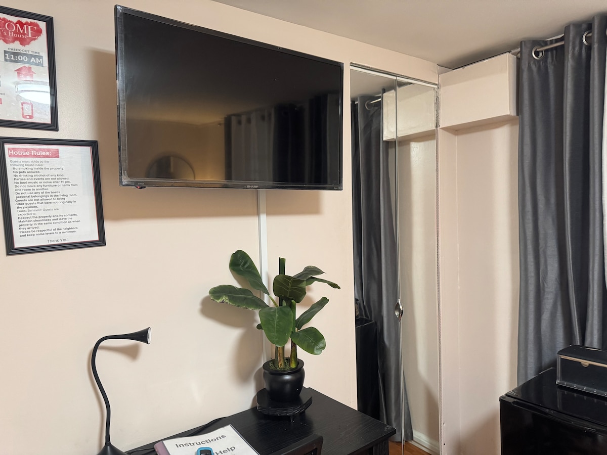 Це помешкання було щойно відремонтовано і тепер має власну ванну кімнату на тому ж рівні! У помешканні є ванна кімната з туалетом, ліжко розміру «queen-size» та міні-кухня (невеликий холодильник, мікрохвильова піч і кавоварка), де є все необхідне для ознайомлення з місцевістю. Безключовий доступ полегшує прибуття. Розташована на затишній житловій вулиці, ви отримаєте решту, необхідну для роботи або ознайомлення з районом.
