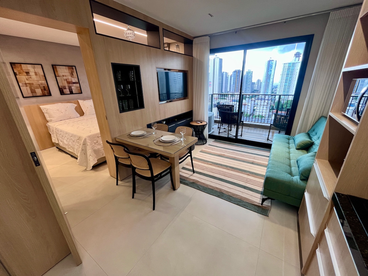 ❗️Унікальний, елегантний і вишуканий новий🤩 кондомініум, щоб ви почувалися як удома. Перегляньте улюблений фільм у спальні або вітальні за допомогою найсучаснішого смарт-телевізора з кондиціонером. Одягайтеся в найкраще ліжко, насолоджуйтеся найпопулярнішим душем, насолоджуйтеся балконом і прекрасним краєвидом і насолоджуйтеся сучасним Сетором Буено в найкращому регіоні Гоянії ! Condomínio Tai Residências