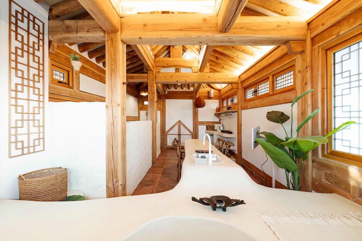 Новий ханок із затишним виглядом і вінтажною дерев’яною обстановкою, яка створює атмосферу глибини. Текстура старого дерева, яка природно перетворилася на гладку оброблену конструкцію, додає помешканню тепла, а інтер’єр – це еклектичне поєднання сучасної та традиційної краси, яке привертає увагу глядача. Коли ви підніметеся на другий поверх, ви побачите зовсім інший світ. Тераса з екзотичним балійським мотивом і джакузі створюють атмосферу затишку в місті. Завдяки природним меблям, текстильним акцентам у м’яких тонах і зеленим рослинам цей простір є справді цілющим місцем для відпочинку тіла й розуму. Цей ханок – гармонійне поєднання східної та екзотичної атмосфери минулого, де гості можуть отримати унікальні враження, аніж у звичайному будинку.