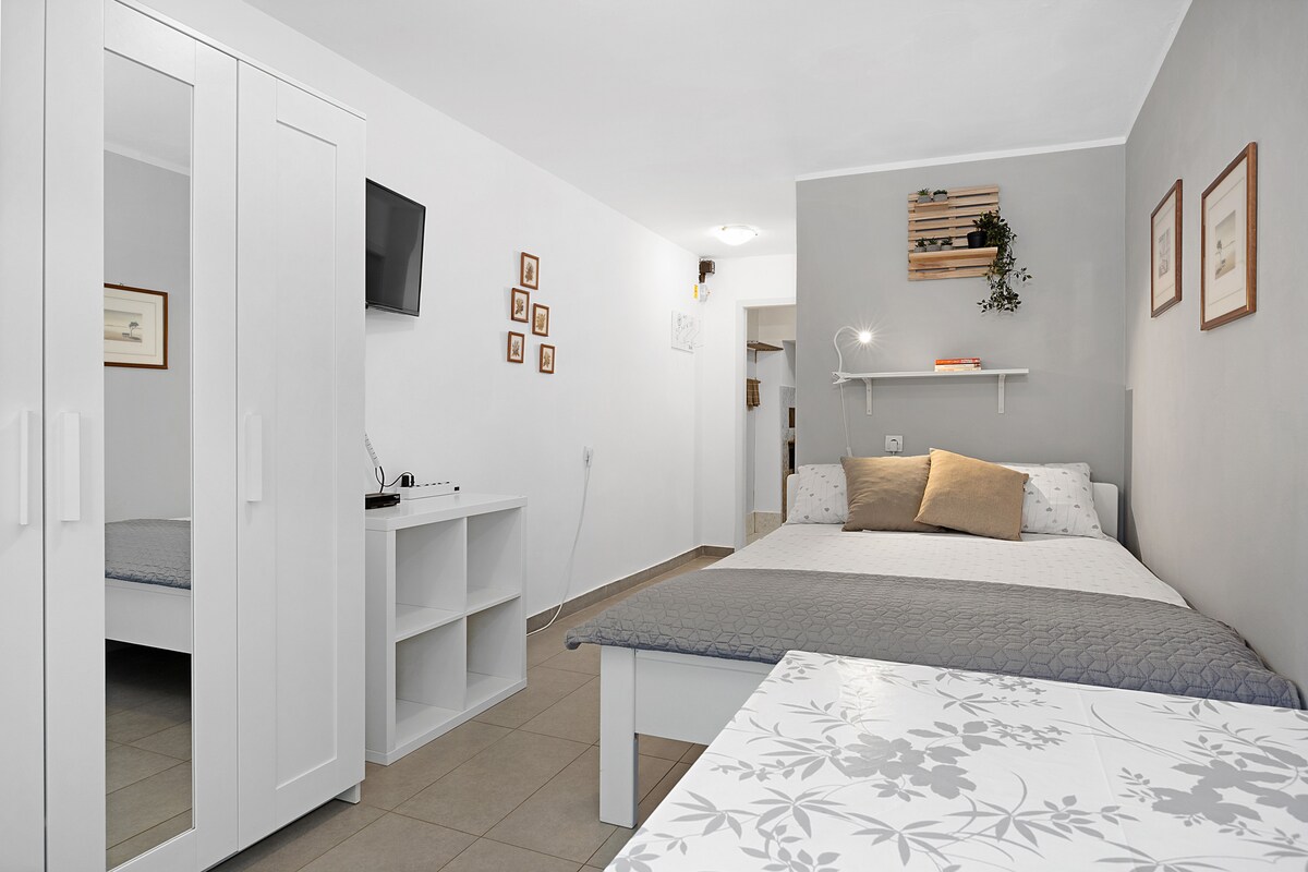 Our studio apartment is located in Pula (Krležina Street 31) in an older building from 1980. The building does not look very attractive, but the apartment is completely renovated and is ideal for two people. The nearest BEACH is 500 meters away or 5-10 minutes walk. The CITY CENTER is 1.8 km from the apartment. And with the car or by bus can be reached in 5-7minute. Shopping centre Max city is 1 km away where are many bigger essential stores and (super)market.